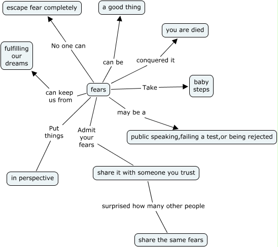 此概念图以 IHMC CmapTools 创建, 内含信息有关于: B10128019-5, fears Take baby steps, fears Put things in perspective, fears Admit your fears share it with someone you trust, fears can be a good thing, share it with someone you trust surprised how many other people share the same fears, fears No one can escape fear completely, fears can keep us from fulfilling our dreams, fears conquered it you are died, fears may be a public speaking,failing a test,or being rejected