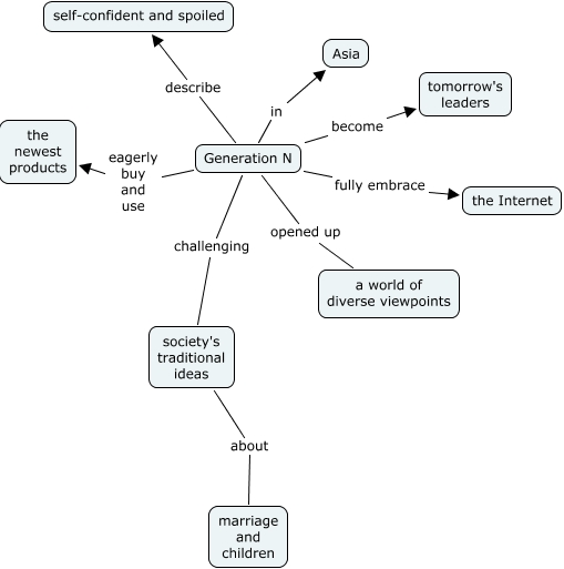 此概念图以 IHMC CmapTools 创建, 内含信息有关于: B10128019-6, Generation N challenging society's traditional ideas, Generation N in Asia, society's traditional ideas about marriage and children, Generation N opened up a world of diverse viewpoints, Generation N eagerly buy and use the newest products, Generation N fully embrace the Internet, Generation N become tomorrow's leaders, Generation N describe self-confident and spoiled
