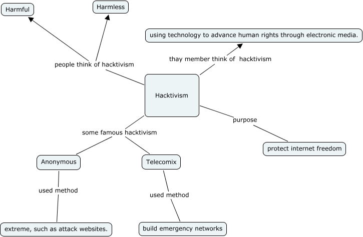 此概念图以 IHMC CmapTools 创建, 内含信息有关于: Task - 3 Hacktivism, Hacktivism people think of hacktivism Harmless, Hacktivism people think of hacktivism Harmful, Hacktivism thay member think of hacktivism using technology to advance human rights through electronic media., Anonymous used method extreme, such as attack websites., Hacktivism purpose protect internet freedom, Hacktivism some famous hacktivism Anonymous, Telecomix used method build emergency networks, Hacktivism some famous hacktivism Telecomix