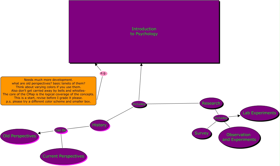 This Concept Map, created with IHMC CmapTools, has information related to: Mcnew Example Ch.1, Research Includes History, History Can Be Current Perspectives, Needs much more development. what are old perspectives? basic tenets of them? Think about varying colors if you use them. Also don't get carried away by bells and whistles- The core of the CMap is the logical coverage of the concepts. This is a start, revise before I grade it please. p.s. please try a different color scheme and smaller box. e.g. Introduction to Psychology, Research Includes Survey, History Can Be Old Perspectives, Research Includes Lab Experiments, Research Includes Observation and Experiments, Research Includes Introduction to Psychology