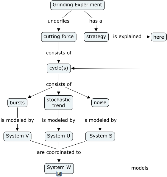 This Concept Map, created with IHMC CmapTools, has information related to: modeling cutting force, System V are coordinated to System W, strategy is explained here, stochastic trend is modeled by System U, cycle(s) consists of noise, Grinding Experiment has a strategy, noise is modeled by System S, System W models cycle(s), cycle(s) consists of bursts, bursts is modeled by System V, System U are coordinated to System W, Grinding Experiment underlies cutting force, cutting force consists of cycle(s), cycle(s) consists of stochastic trend, System S are coordinated to System W
