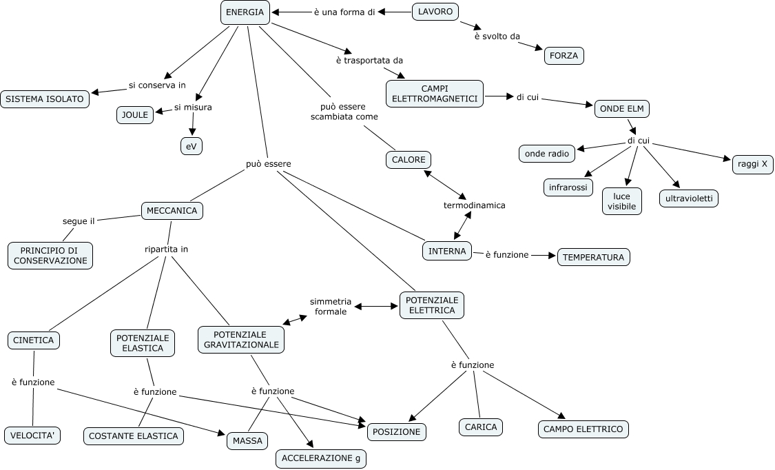 Questa Cmap, creata con IHMC CmapTools, contiene informazioni relative a: energia, ONDE ELM di cui raggi X, ENERGIA è trasportata da CAMPI ELETTROMAGNETICI, POTENZIALE GRAVITAZIONALE è funzione ACCELERAZIONE g, ENERGIA può essere MECCANICA, ONDE ELM di cui luce visibile, ENERGIA si misura JOULE, MECCANICA ripartita in POTENZIALE ELASTICA, ONDE ELM di cui ultravioletti, POTENZIALE ELETTRICA è funzione CAMPO ELETTRICO, POTENZIALE ELASTICA è funzione POSIZIONE, ONDE ELM di cui onde radio, INTERNA è funzione TEMPERATURA, POTENZIALE ELETTRICA è funzione POSIZIONE, POTENZIALE GRAVITAZIONALE è funzione POSIZIONE, LAVORO è svolto da FORZA, ENERGIA può essere POTENZIALE ELETTRICA, ENERGIA si misura eV, POTENZIALE GRAVITAZIONALE è funzione MASSA, ENERGIA può essere INTERNA, MECCANICA segue il PRINCIPIO DI CONSERVAZIONE
