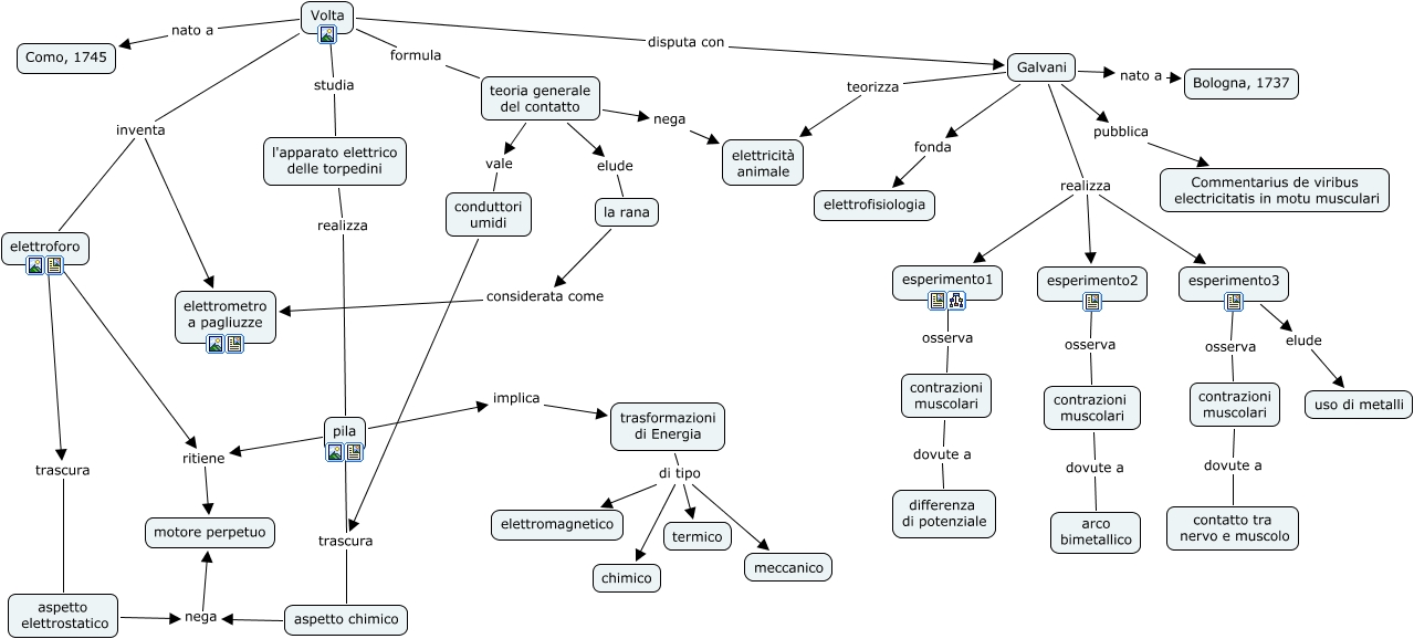Questa Cmap, creata con IHMC CmapTools, contiene informazioni relative a: volta, Galvani realizza esperimento2, esperimento1 osserva contrazioni muscolari, esperimento3 osserva contrazioni muscolari, aspetto elettrostatico nega motore perpetuo, Volta formula teoria generale del contatto, teoria generale del contatto vale conduttori umidi, trasformazioni di Energia di tipo chimico, trasformazioni di Energia di tipo elettromagnetico, pila implica trasformazioni di Energia, l'apparato elettrico delle torpedini realizza pila, esperimento2 osserva contrazioni muscolari, Volta studia l'apparato elettrico delle torpedini, Galvani fonda elettrofisiologia, trasformazioni di Energia di tipo termico, Volta disputa con Galvani, elettroforo ritiene motore perpetuo, Volta inventa elettrometro a pagliuzze, la rana considerata come elettrometro a pagliuzze, contrazioni muscolari dovute a contatto tra nervo e muscolo, Galvani nato a Bologna, 1737
