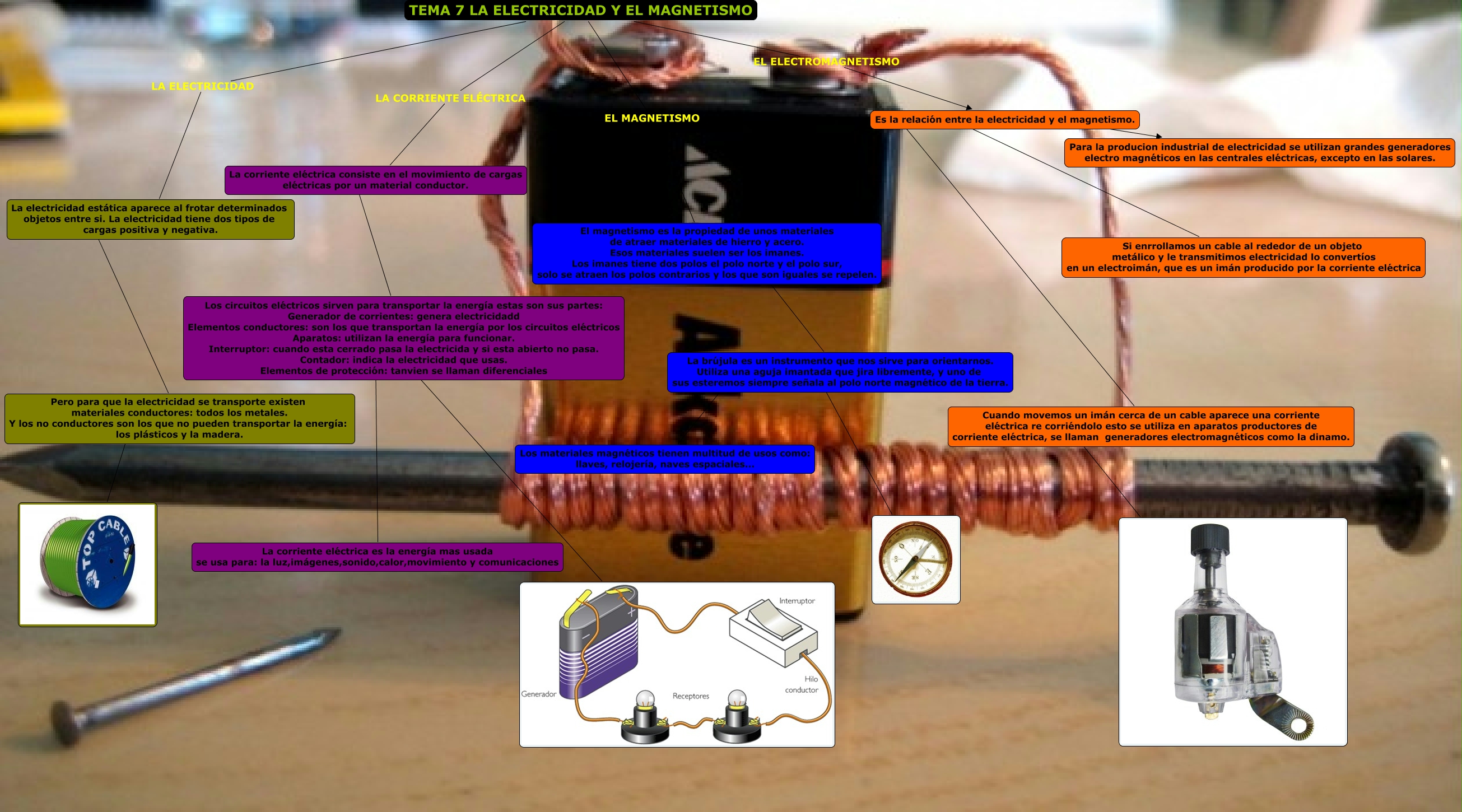 Este Cmap, tiene información relacionada con: cono tema 7 SAMUEL, La electricidad estática aparece al frotar determinados objetos entre si. La electricidad tiene dos tipos de cargas positiva y negativa. ???? Pero para que la electricidad se transporte existen materiales conductores: todos los metales. Y los no conductores son los que no pueden transportar la energía: los plásticos y la madera., La brújula es un instrumento que nos sirve para orientarnos. Utiliza una aguja imantada que jira libremente, y uno de sus esteremos siempre señala al polo norte magnético de la tierra. ????, Es la relación entre la electricidad y el magnetismo. ???? Si enrrollamos un cable al rededor de un objeto metálico y le transmitimos electricidad lo convertíos en un electroimán, que es un imán producido por la corriente eléctrica, La corriente eléctrica consiste en el movimiento de cargas eléctricas por un material conductor. ???? Los circuitos eléctricos sirven para transportar la energía estas son sus partes: Generador de corrientes: genera electricidadd Elementos conductores: son los que transportan la energía por los circuitos eléctricos Aparatos: utilizan la energía para funcionar. Interruptor: cuando esta cerrado pasa la electricida y si esta abierto no pasa. Contador: indica la electricidad que usas. Elementos de protección: tanvien se llaman diferenciales, El magnetismo es la propiedad de unos materiales de atraer materiales de hierro y acero. Esos materiales suelen ser los imanes. Los imanes tiene dos polos el polo norte y el polo sur, solo se atraen los polos contrarios y los que son iguales se repelen. ???? La brújula es un instrumento que nos sirve para orientarnos. Utiliza una aguja imantada que jira libremente, y uno de sus esteremos siempre señala al polo norte magnético de la tierra., TEMA 7 LA ELECTRICIDAD Y EL MAGNETISMO LA ELECTRICIDAD La electricidad estática aparece al frotar determinados objetos entre si. La electricidad tiene dos tipos de cargas positiva y negativa., Pero para que la electricidad se transporte existen materiales conductores: todos los metales. Y los no conductores son los que no pueden transportar la energía: los plásticos y la madera. ????, Cuando movemos un imán cerca de un cable aparece una corriente eléctrica re corriéndolo esto se utiliza en aparatos productores de corriente eléctrica, se llaman generadores electromagnéticos como la dinamo. ????, La brújula es un instrumento que nos sirve para orientarnos. Utiliza una aguja imantada que jira libremente, y uno de sus esteremos siempre señala al polo norte magnético de la tierra. ???? Los materiales magnéticos tienen multitud de usos como: llaves, relojería, naves espaciales..., Es la relación entre la electricidad y el magnetismo. ???? Para la producion industrial de electricidad se utilizan grandes generadores electro magnéticos en las centrales eléctricas, excepto en las solares., Los circuitos eléctricos sirven para transportar la energía estas son sus partes: Generador de corrientes: genera electricidadd Elementos conductores: son los que transportan la energía por los circuitos eléctricos Aparatos: utilizan la energía para funcionar. Interruptor: cuando esta cerrado pasa la electricida y si esta abierto no pasa. Contador: indica la electricidad que usas. Elementos de protección: tanvien se llaman diferenciales ???? La corriente eléctrica es la energía mas usada se usa para: la luz,imágenes,sonido,calor,movimiento y comunicaciones, TEMA 7 LA ELECTRICIDAD Y EL MAGNETISMO EL ELECTROMAGNETISMO Es la relación entre la electricidad y el magnetismo., Los circuitos eléctricos sirven para transportar la energía estas son sus partes: Generador de corrientes: genera electricidadd Elementos conductores: son los que transportan la energía por los circuitos eléctricos Aparatos: utilizan la energía para funcionar. Interruptor: cuando esta cerrado pasa la electricida y si esta abierto no pasa. Contador: indica la electricidad que usas. Elementos de protección: tanvien se llaman diferenciales ????, Es la relación entre la electricidad y el magnetismo. ???? Cuando movemos un imán cerca de un cable aparece una corriente eléctrica re corriéndolo esto se utiliza en aparatos productores de corriente eléctrica, se llaman generadores electromagnéticos como la dinamo., TEMA 7 LA ELECTRICIDAD Y EL MAGNETISMO EL MAGNETISMO El magnetismo es la propiedad de unos materiales de atraer materiales de hierro y acero. Esos materiales suelen ser los imanes. Los imanes tiene dos polos el polo norte y el polo sur, solo se atraen los polos contrarios y los que son iguales se repelen., TEMA 7 LA ELECTRICIDAD Y EL MAGNETISMO LA CORRIENTE ELÉCTRICA La corriente eléctrica consiste en el movimiento de cargas eléctricas por un material conductor.