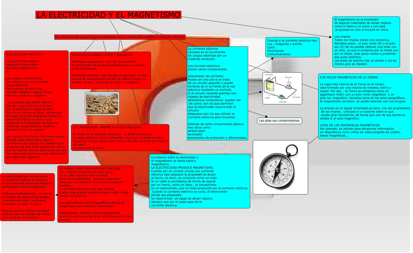 Este Cmap, tiene información relacionada con: furi 7, LA ELECTRICIDAD Y EL MAGNETISMO ???? Es una forma de energía que se manifiesta como: electricidad estática y corriente eléctrica, LA ELECTRICIDAD Y EL MAGNETISMO ???? El magnetismo es la propiedad de algunos materiales de atraer objetos como el hierro y el acero y con esta propiedad se creo la brujula en china. Los imanes Todos los imanes tienen dos extremos, llamados polos , el polo norte (N) y el polo sur (S).No es posible obtener una imán con un solo, ya que si cortamos por la mitad uno por la mitad, cada parte vuelve a presentar dos polos distintos. Los polos de distinto tipo se atraen y los de mismo polo se repelen., La relación entre la electricidad y el magnetismo se llama electro- magnétismo. LA ELECTRICIDAD PRODUCE MAGNETISMO. Cuando por un circuito circula una corriente eléctrica este adquiere la propiedad de atraer al hierro, es decir, se comporta como un imán Si un cable lo enrollamos de forma de espiral por un hierro, como un clavo , lo convertimos en un electroimán, que un iman producido por la corriente eléctrica. Cuando la corriente eléctrica se corta, el electroimán pierde esa propiedad. Un electroimán es capaz de atraer objetos siempre que por el cable pase de la corriente electrica. ???? EL MAGNETISMO PRODUCE ELECTRICIDAD Así , cuando movemos un imán cerca de un cable aparece una corriente eléctrica recorriéndolo , que solo podemos observar insertando en el circuito un aparato medidor. La corriente eléctrica será más intensa cuanto más grande y potente sea el imán y más rápido lo movamos. Los generadores electromagnéticos utilizan el magnetismo para producir electricidad . Generadores: dinamo y otros generadores que funcionan haciendo girar una bobina entre dos imanes., La corriente eléctrica consiste en el movimiento de cargas eléctricas por un material conductor. Los circuitos eléctricos tienen varios componentes: ∙Generador de corriente: Puede ser una pila si se trata de un circuito pequeño o puede tomarse de la corriente de la red eléctrica mediante un enchufe, si el circuito necesita grandes can- tidades de electricidad. ∙Elementos conductores: pueden ser de cobre, son los que permiten que la electricidad recorra todo el circuito. ∙Aparatos:son los que utilizan la corriente eléctrica para funcionar. Además de estos componentes básicos hay otros como: ∙interruptor ∙contador ∙elementos de protección o diferenciales. ???? Gracias a la corriente eléctrica hay: Luz , imagenes y sonido. Calor. Movimiento. Comunicaciones., Es una forma de energía que se manifiesta como: electricidad estática y corriente eléctrica ???? La relación entre la electricidad y el magnetismo se llama electro- magnétismo. LA ELECTRICIDAD PRODUCE MAGNETISMO. Cuando por un circuito circula una corriente eléctrica este adquiere la propiedad de atraer al hierro, es decir, se comporta como un imán Si un cable lo enrollamos de forma de espiral por un hierro, como un clavo , lo convertimos en un electroimán, que un iman producido por la corriente eléctrica. Cuando la corriente eléctrica se corta, el electroimán pierde esa propiedad. Un electroimán es capaz de atraer objetos siempre que por el cable pase de la corriente electrica., La corriente eléctrica consiste en el movimiento de cargas eléctricas por un material conductor. Los circuitos eléctricos tienen varios componentes: ∙Generador de corriente: Puede ser una pila si se trata de un circuito pequeño o puede tomarse de la corriente de la red eléctrica mediante un enchufe, si el circuito necesita grandes can- tidades de electricidad. ∙Elementos conductores: pueden ser de cobre, son los que permiten que la electricidad recorra todo el circuito. ∙Aparatos:son los que utilizan la corriente eléctrica para funcionar. Además de estos componentes básicos hay otros como: ∙interruptor ∙contador ∙elementos de protección o diferenciales. ???? Las pilas son contaminantes., MATERIALES CONDUCTORES Y AISLANTES Materiales conductores: Son los que permiten el movimiento de la cargas eléctricas por su interior, como los metales. Materiales aislantes .Son los que no permiten el movi- miento de la carga eléctrica por su interior, como la madera, el pelo , la goma, el vidrio o el plástico. ???? ????, LA ELECTRICIDAD Y EL MAGNETISMO ???? La corriente eléctrica consiste en el movimiento de cargas eléctricas por un material conductor. Los circuitos eléctricos tienen varios componentes: ∙Generador de corriente: Puede ser una pila si se trata de un circuito pequeño o puede tomarse de la corriente de la red eléctrica mediante un enchufe, si el circuito necesita grandes can- tidades de electricidad. ∙Elementos conductores: pueden ser de cobre, son los que permiten que la electricidad recorra todo el circuito. ∙Aparatos:son los que utilizan la corriente eléctrica para funcionar. Además de estos componentes básicos hay otros como: ∙interruptor ∙contador ∙elementos de protección o diferenciales., LOS POLOS MAGNÉTICOS DE LA TIERRA La capa más interna de la Tierra es el núcleo, está formado por una mezcla de metales, hierro y níquel. Por eso , la Tierra se comporta como un gigantesco imán, con un polo norte magnético y un polo sur magnético, situados cerca de los polos geográficos . El magnetismo terrestre se puede detectar con una brújula. La brújula es un aguja inmantada,es decir, con las propiedades de los imanes , colocada e un soporte sobre el que puede girar libremente, de forma que uno de sus extremos señala a un polo magnético. USOS DE LOS MATERIALES MAGNÉTICOS. Por ejemplo, se utilizan para almacenar información en dispositivos como cintas de vídeo,targetas de credito, llaves magnéticas... ????, Es una forma de energía que se manifiesta como: electricidad estática y corriente eléctrica ???? MATERIALES CONDUCTORES Y AISLANTES Materiales conductores: Son los que permiten el movimiento de la cargas el