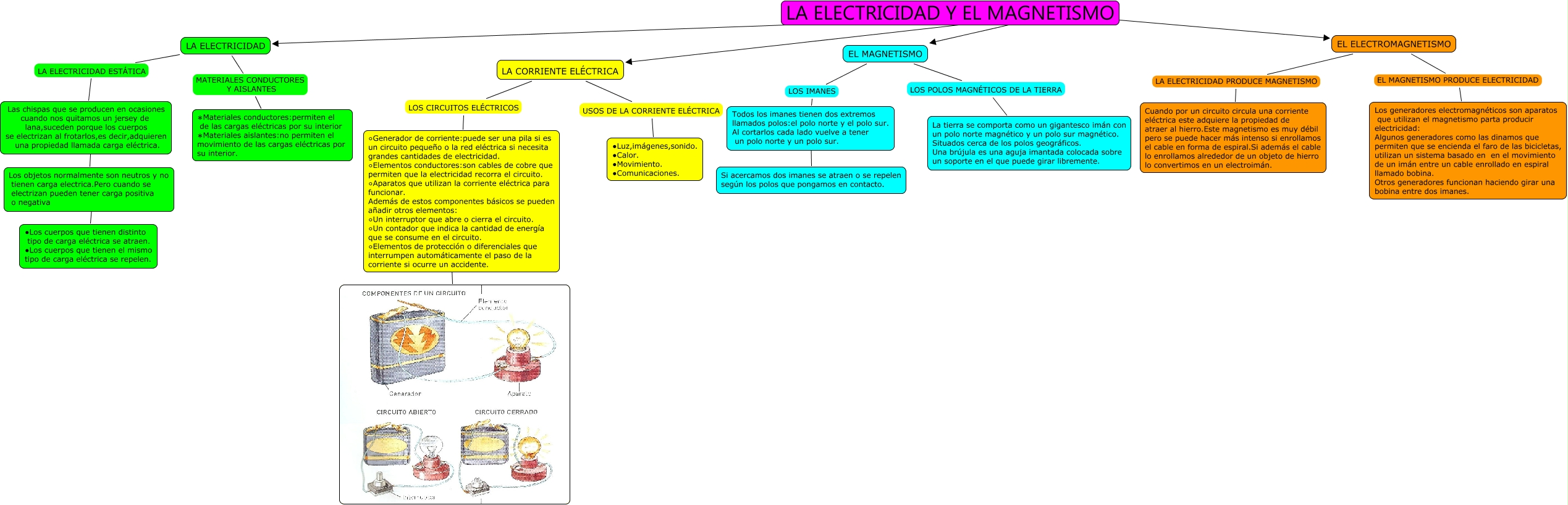 Este Cmap, tiene información relacionada con: mapa conceptual tema 7 maría, LA CORRIENTE ELÉCTRICA LOS CIRCUITOS ELÉCTRICOS ∘Generador de corriente:puede ser una pila si es un circuito pequeño o la red eléctrica si necesita grandes cantidades de electricidad. ∘Elementos conductores:son cables de cobre que permiten que la electricidad recorra el circuito. ∘Aparatos que utilizan la corriente eléctrica para funcionar. Además de estos componentes básicos se pueden añadir otros elementos: ∘Un interruptor que abre o cierra el circuito. ∘Un contador que indica la cantidad de energía que se consume en el circuito. ∘Elementos de protección o diferenciales que interrumpen automáticamente el paso de la corriente si ocurre un accidente., EL MAGNETISMO LOS IMANES Todos los imanes tienen dos extremos llamados polos:el polo norte y el polo sur. Al cortarlos cada lado vuelve a tener un polo norte y un polo sur., Todos los imanes tienen dos extremos llamados polos:el polo norte y el polo sur. Al cortarlos cada lado vuelve a tener un polo norte y un polo sur. ???? Si acercamos dos imanes se atraen o se repelen según los polos que pongamos en contacto., LA ELECTRICIDAD LA ELECTRICIDAD ESTÁTICA Las chispas que se producen en ocasiones cuando nos quitamos un jersey de lana,suceden porque los cuerpos se electrizan al frotarlos,es decir,adquieren una propiedad llamada carga eléctrica., Los objetos normalmente son neutros y no tienen carga electrica.Pero cuando se electrizan pueden tener carga positiva o negativa ???? ∙Los cuerpos que tienen distinto tipo de carga eléctrica se atraen. ∙Los cuerpos que tienen el mismo tipo de carga eléctrica se repelen., LA ELECTRICIDAD Y EL MAGNETISMO ???? EL MAGNETISMO, LA ELECTRICIDAD MATERIALES CONDUCTORES Y AISLANTES ∗Materiales conductores:permiten el de las cargas eléctricas por su interior ∗Materiales aislantes:no permiten el movimiento de las cargas eléctricas por su interior., Las chispas que se producen en ocasiones cuando nos quitamos un jersey de lana,suceden porque los cuerpos se electrizan al frotarlos,es decir,adquieren una propiedad llamada carga eléctrica. ???? Los objetos normalmente son neutros y no tienen carga electrica.Pero cuando se electrizan pueden tener carga positiva o negativa, EL ELECTROMAGNETISMO LA ELECTRICIDAD PRODUCE MAGNETISMO Cuando por un circuito circula una corriente eléctrica este adquiere la propiedad de atraer al hierro.Este magnetismo es muy débil pero se puede hacer más intenso si enrollamos el cable en forma de espiral.Si además el cable lo enrollamos alrededor de un objeto de hierro lo convertimos en un electroimán., LA ELECTRICIDAD Y EL MAGNETISMO ???? EL ELECTROMAGNETISMO, LA ELECTRICIDAD Y EL MAGNETISMO ???? LA CORRIENTE ELÉCTRICA, LA CORRIENTE ELÉCTRICA USOS DE LA CORRIENTE ELÉCTRICA ∙Luz,imágenes,sonido. ∙Calor. ∙Movimiento. ∙Comunicaciones., LA ELECTRICIDAD Y EL MAGNETISMO ???? LA ELECTRICIDAD, EL MAGNETISMO LOS POLOS MAGNÉTICOS DE LA TIERRA La tierra se comporta como un gigantesco imán con un polo norte magnético y un polo sur magnético. Situados cerca de los polos geográficos. Una brújula es una aguja imantada colocada sobre un soporte en el que puede girar libremente., EL ELECTROMAGNETISMO EL MAGNETISMO PRODUCE ELECTRICIDAD Los generadores electromagnéticos son aparatos que utilizan el magnetismo parta producir electricidad: Algunos generadores como las dinamos que permiten que se encienda el faro de las bicicletas, utilizan un sistema basado en en el movimiento de un imán entre un cable enrollado en espiral llamado bobina. Otros generadores funcionan haciendo girar una bobina entre dos imanes., ∘Generador de corriente:puede ser una pila si es un circuito pequeño o la red eléctrica si necesita grandes cantidades de electricidad. ∘Elementos conductores:son cables de cobre que permiten que la electricidad recorra el circuito. ∘Aparatos que utilizan la corriente eléctrica para funcionar. Además de estos componentes básicos se pueden añadir otros elementos: ∘Un interruptor que abre o cierra el circuito. ∘Un contador que indica la cantidad de energía que se consume en el circuito. ∘Elementos de protección o diferenciales que interrumpen automáticamente el paso de la corriente si ocurre un accidente. ????
