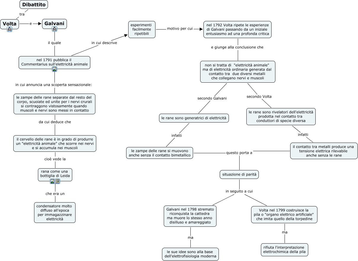 Questa Cmap, creata con IHMC CmapTools, contiene informazioni relative a: Volta - Galvani, Galvani nel 1798 stremato riconquista la cattedra ma muore lo stesso anno disilluso e amareggiato ma le sue idee sono alla base dell'elettrofisiologia moderna, Dibattito tra Volta, le zampe delle rane si muovono anche senza il contatto bimetallico questo porta a situazione di parità, situazione di parità in seguito a cui Galvani nel 1798 stremato riconquista la cattedra ma muore lo stesso anno disilluso e amareggiato, situazione di parità in seguito a cui Volta nel 1799 costruisce la pila o "organo elettrico artificiale" che imita quello della torpedine, non si tratta di "elettricità animale" ma di elettricità ordinaria generata dal contatto tra due diversi metalli che collegano nervi e muscoli secondo Volta le rane sono rivelatori dell'elettricità prodotta nel contatto tra conduttori di specie diversa, nel 1792 Volta ripete le esperienze di Galvani passando da un iniziale entusiasmo ad una profonda critica e giunge alla conclusione che non si tratta di "elettricità animale" ma di elettricità ordinaria generata dal contatto tra due diversi metalli che collegano nervi e muscoli, Volta e Galvani, il contatto tra metalli produce una tensione elettrica rilevabile anche senza le rane questo porta a situazione di parità, Volta nel 1799 costruisce la pila o "organo elettrico artificiale" che imita quello della torpedine ma rifiuta l'interpretazione elettrochimica della pila, le zampe delle rane separate dal resto del corpo, scuoiate ed unite per i nervi crurali si contraggono vistosamente quando muscoli e nervi sono messi in contatto da cui deduce che il cervello delle rane è in grado di produrre un "elettricità animale" che scorre nei nervi e si accumula nei muscoli, rana come una bottiglia di Leida che era un condensatore molto diffuso all'epoca per immagazzinare elettricità, le rane sono generatrici di elettricità infatti le zampe delle rane si muovono anche senza il contatto bimetallico, Galvani il quale nel 1791 pubblica il Commentarius sull'elettricità animale, esperimenti facilmente ripetibili motivo per cui nel 1792 Volta ripete le esperienze di Galvani passando da un iniziale entusiasmo ad una profonda critica, le rane sono rivelatori dell'elettricità prodotta nel contatto tra conduttori di specie diversa infatti il contatto tra metalli produce una tensione elettrica rilevabile anche senza le rane, il cervello delle rane è in grado di produrre un "elettricità animale" che scorre nei nervi e si accumula nei muscoli cioè vede la rana come una bottiglia di Leida, nel 1791 pubblica il Commentarius sull'elettricità animale in cui annuncia una scoperta sensazionale: le zampe delle rane separate dal resto del corpo, scuoiate ed unite per i nervi crurali si contraggono vistosamente quando muscoli e nervi sono messi in contatto, nel 1791 pubblica il Commentarius sull'elettricità animale in cui descrive esperimenti facilmente ripetibili, non si tratta di "elettricità animale" ma di elettricità ordinaria generata dal contatto tra due diversi metalli che collegano nervi e muscoli secondo Galvani le rane sono generatrici di elettricità