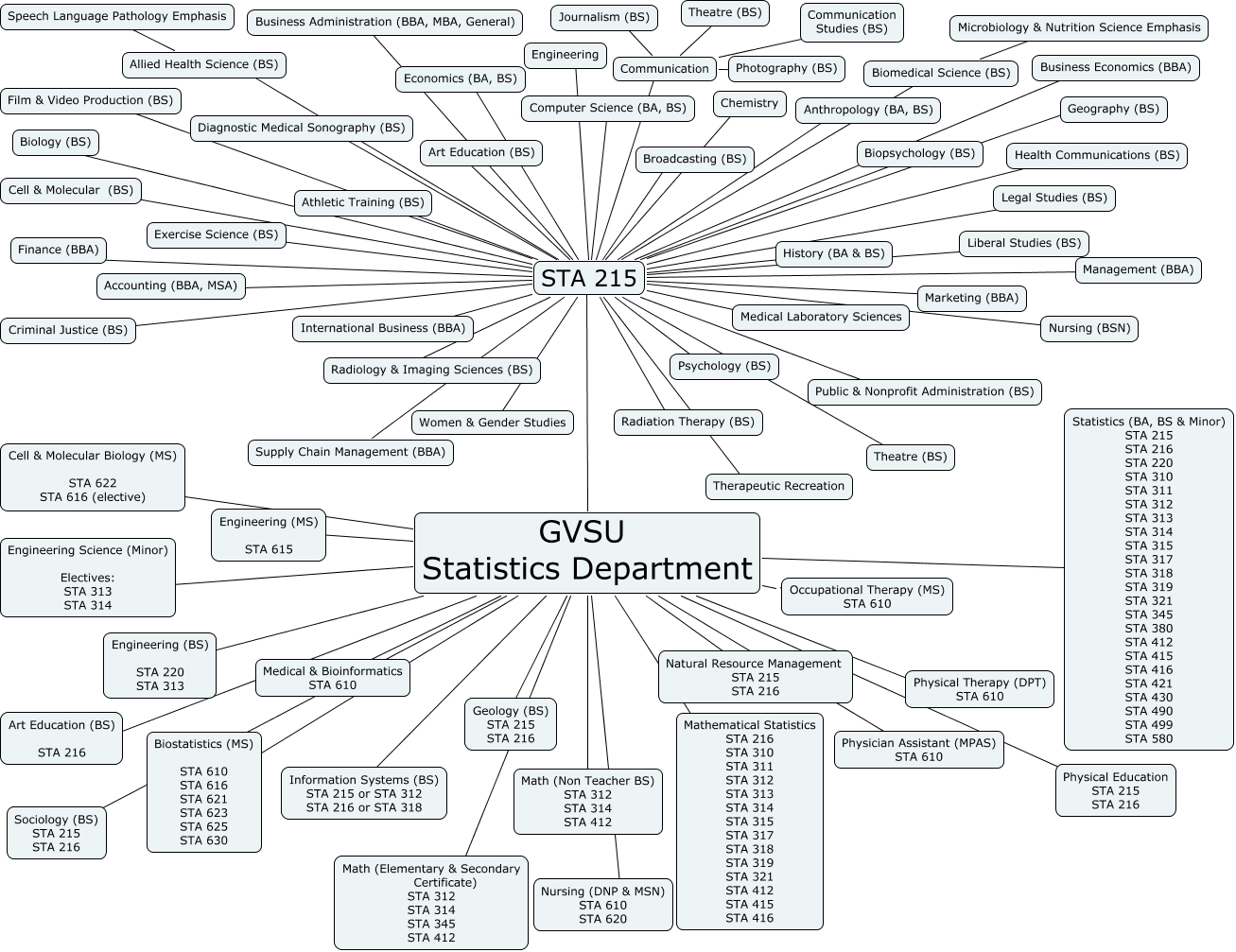This Concept Map, created with IHMC CmapTools, has information related to: GVSU Statistics Department Assessment Project.cmap, STA 215 ???? Art Education (BS), STA 215 ???? Geography (BS), STA 215 ???? Diagnostic Medical Sonography (BS), GVSU Statistics Department ???? Engineering (BS) STA 220 STA 313, STA 215 ???? Broadcasting (BS), STA 215 ???? Marketing (BBA), GVSU Statistics Department ???? Cell & Molecular Biology (MS) STA 622 STA 616 (elective), Communication ???? Theatre (BS), GVSU Statistics Department ???? Nursing (DNP & MSN) STA 610 STA 620, STA 215 ???? Criminal Justice (BS), STA 215 ???? Economics (BA, BS), Allied Health Science (BS) ???? Speech Language Pathology Emphasis, STA 215 ???? Nursing (BSN), STA 215 ???? Women & Gender Studies, STA 215 ???? Accounting (BBA, MSA), STA 215 ???? Chemistry, STA 215 ???? Cell & Molecular (BS), GVSU Statistics Department ???? Occupational Therapy (MS) STA 610, STA 215 ???? Allied Health Science (BS), STA 215 ???? Biomedical Science (BS)