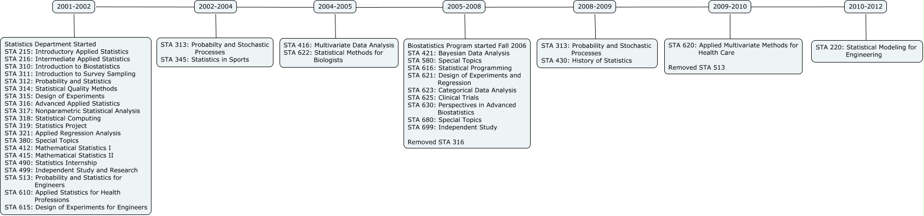 This Concept Map, created with IHMC CmapTools, has information related to: Classtimeline.cmap, Biostatistics Program started Fall 2006 STA 421: Bayesian Data Analysis STA 580: Special Topics STA 616: Statistical Programming STA 621: Design of Experiments and Regression STA 623: Categorical Data Analysis STA 625: Clinical Trials STA 630: Perspectives in Advanced Biostatistics STA 680: Special Topics STA 699: Independent Study Removed STA 316 ???? 2005-2008, STA 620: Applied Multivariate Methods for Health Care Removed STA 513 ???? 2009-2010, STA 220: Statistical Modeling for Engineering ???? 2010-2012, STA 416: Multivariate Data Analysis STA 622: Statistical Methods for Biologists ???? 2004-2005, 2001-2002 ???? ????, STA 313: Probability and Stochastic Processes STA 430: History of Statistics ???? 2008-2009, Statistics Department Started STA 215: Introductory Applied Statistics STA 216: Intermediate Applied Statistics STA 310: Introduction to Biostatistics STA 311: Introduction to Survey Sampling STA 312: Probability and Statistics STA 314: Statistical Quality Methods STA 315: Design of Experiments STA 316: Advanced Applied Statistics STA 317: Nonparametric Statistical Analysis STA 318: Statistical Computing STA 319: Statistics Project STA 321: Applied Regression Analysis STA 380: Special Topics STA 412: Mathematical Statistics I STA 415: Mathematical Statistics II STA 490: Statistics Internship STA 499: Independent Study and Research STA 513: Probability and Statistics for Engineers STA 610: Applied Statistics for Health Professions STA 615: Design of Experiments for Engineers ???? 2001-2002, STA 313: Probabilty and Stochastic Processes STA 345: Statistics in Sports ???? 2002-2004