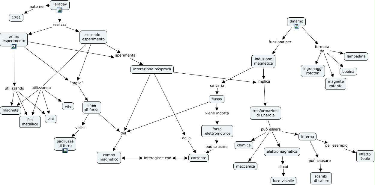 Questa Cmap, creata con IHMC CmapTools, contiene informazioni relative a: Faraday - campo magnetico, primo esperimento utilizzando filo metallico, dinamo formata da bobina, interazione reciproca della corrente, secondo esperimento utilizzando magnete, secondo esperimento utilizzando filo metallico, induzione magnetica implica trasformazioni di Energia, Faraday nato nel 1791, forza elettromotrice può causare corrente, trasformazioni di Energia può essere interna, flusso del campo magnetico, induzione magnetica se varia flusso, secondo esperimento sperimenta interazione reciproca, primo esperimento utilizzando magnete, linee di forza visibili pagliuzze di ferro, trasformazioni di Energia può essere elettromagnetica, dinamo formata da ingranaggi rotatori, secondo esperimento utilizzando pila, campo magnetico interagisce con corrente, secondo esperimento utilizzando vite, dinamo formata da magnete rotante