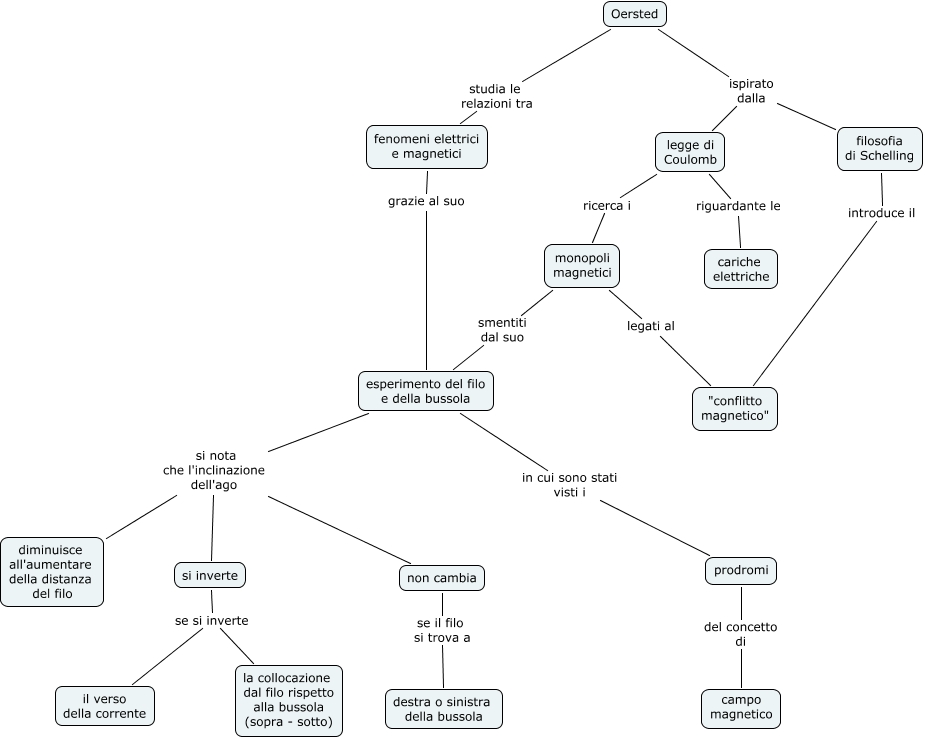 Questa Cmap, creata con IHMC CmapTools, contiene informazioni relative a: oersted, legge di Coulomb riguardante le cariche elettriche, si inverte se si inverte il verso della corrente, si inverte se si inverte la collocazione dal filo rispetto alla bussola (sopra - sotto), filosofia di Schelling introduce il "conflitto magnetico", esperimento del filo e della bussola si nota che l'inclinazione dell'ago si inverte, prodromi del concetto di campo magnetico, esperimento del filo e della bussola si nota che l'inclinazione dell'ago non cambia, fenomeni elettrici e magnetici grazie al suo esperimento del filo e della bussola, esperimento del filo e della bussola in cui sono stati visti i prodromi, esperimento del filo e della bussola si nota che l'inclinazione dell'ago diminuisce all'aumentare della distanza del filo, non cambia se il filo si trova a destra o sinistra della bussola, Oersted studia le relazioni tra fenomeni elettrici e magnetici, monopoli magnetici legati al "conflitto magnetico", Oersted ispirato dalla legge di Coulomb, monopoli magnetici smentiti dal suo esperimento del filo e della bussola, Oersted ispirato dalla filosofia di Schelling, legge di Coulomb ricerca i monopoli magnetici