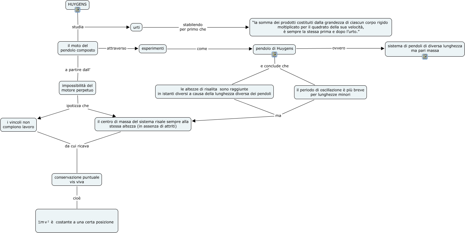 </mtext> </mrow> </math>, le altezze di risalita sono raggiunte in istanti diversi a causa della lunghezza diversa dei pendoli ma il centro di massa del sistema risale sempre alla stessa altezza (in assenza di attriti), HUYGENS studia urti, i vincoli non compiono lavoro da cui ricava conservazione puntuale vis viva, pendolo di Huygens e conclude che le altezze di risalita sono raggiunte in istanti diversi a causa della lunghezza diversa dei pendoli, il periodo di oscillazione è più breve per lunghezze minori ma il centro di massa del sistema risale sempre alla stessa altezza (in assenza di attriti), il centro di massa del sistema risale sempre alla stessa altezza (in assenza di attriti) da cui ricava conservazione puntuale vis viva, il moto del pendolo composto attraverso esperimenti, impossibilità del motore perpetuo ipotizza che i vincoli non compiono lavoro, esperimenti come pendolo di Huygens, HUYGENS studia il moto del pendolo composto, impossibilità del motore perpetuo ipotizza che il centro di massa del sistema risale sempre alla stessa altezza (in assenza di attriti), pendolo di Huygens e conclude che il periodo di oscillazione è più breve per lunghezze minori, il moto del pendolo composto a partire dall' impossibilità del motore perpetuo, pendolo di Huygens ovvero sistema di pendoli di diversa lunghezza ma pari massa