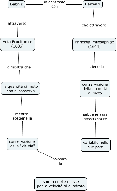 Questa Cmap, creata con IHMC CmapTools, contiene informazioni relative a: cartesio-leibniz, conservazione della "vis via" ovvero la somma delle masse per la velocità al quadrato, Leibniz in contrasto con Cartesio, Acta Eruditorum (1686) dimostra che la quantità di moto non si conserva, Cartesio che attravero Principia Philosophiae (1644), la quantità di moto non si conserva mentre sostiene la conservazione della "vis via", Leibniz attraverso Acta Eruditorum (1686), Principia Philosophiae (1644) sostiene la conservazione della quantità di moto, conservazione della quantità di moto sebbene essa possa essere variabile nelle sue parti