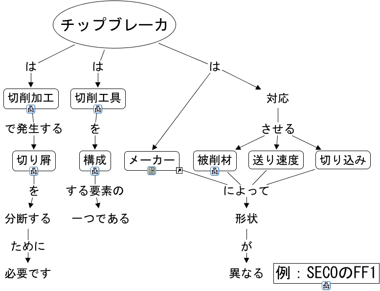 こ�?�コンセプトマップに関連する�?報: チップブレーカ, 対�? させ�? �?り込み, �?断する ために �?要で�?, チップブレーカ は メーカー, 対�? させ�? 送り速度, チップブレーカ は �?削加工, �?り込み によって 形状, 対�? させ�? 被削材, チップブレーカ は �?削工具, 送り速度 によって 形状, �?り�? �? �?断する, 被削材 によって 形状, メーカー によって 形状, �?削工具 �? 構�??, 形状 �? 異な�?, �?削加工 で発生す�? �?り�?, 構�?? する要�?の �?つである, チップブレーカ は 対�?