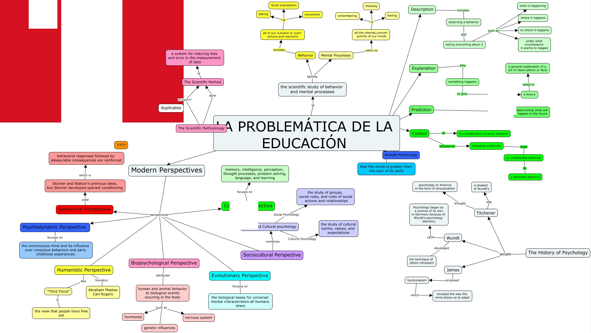 Este Cmap, tiene información relacionada con: Anthony Ch 1 22, Wundt developed the technique of object introspect, Titchener was a student of Wundt's, Behavioral Perspective used Skinner and Watson's previous ideas, but Skinner developed operant conditioning, Description includes observing a behavior, Behavior includes all of our outward or overt actions and reactions, Psychodynamic Perspective focuses on the unconscious mind and its influence over conscious behaviors and early childhood experiences., LA PROBLEMÁTICA DE LA EDUCACIÓN is the scientific study of behavior and mental processes, changing a behavior from an undesirable behavior, Cogntive Perspective focuses on memory, intelligence, perception, thought processes, problem solving, language, and learning, all of our outward or overt actions and reactions i.e. movement, Control is the modification of some behavior, Modern Perspectives perspectives Evolutionary Perspective, LA PROBLEMÁTICA DE LA EDUCACIÓN Goals Prediction, human and animal behavior to biological events occuring in the body such as hormones, noting everything about it such as what is happening, Titchener brought psychology to America in the form of structuralism, a theory which is a general explanation of a set of observations or facts, all of our outward or overt actions and reactions i.e. facial expressions, LA PROBLEMÁTICA DE LA EDUCACIÓN Goals Explanation, noting everything about it such as to whom it happens