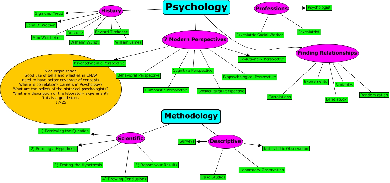 This Concept Map, created with IHMC CmapTools, has information related to: Cori Day Ch.1 17, Methodology Scientific 2) Forming a Hypothesis, Methodology Descriptive Laboratory Observation, Psychology History William James, Psychology Finding Relationships Randomization, Psychology Professions Psychologist, Psychology Finding Relationships Blind study, Methodology Scientific 1) Percieving the Question, Psychology Finding Relationships Correlations, Psychology 7 Modern Perspectives Humanistic Perspective, Methodology Scientific 4) Drawing Conclusions, Psychology 7 Modern Perspectives Sociocultural Perspective, Psychology 7 Modern Perspectives Evolutionary Perspective, Methodology Descriptive Naturalistic Observation, Psychology 7 Modern Perspectives Biopsychological Perspective, Psychology Professions Psychiatric Social Worker, Psychology Finding Relationships Variables, Psychology 7 Modern Perspectives Psychodynamic Perspective, Psychology History John B. Watson, Methodology Scientific 3) Testing the Hypothesis, Psychology 7 Modern Perspectives Behavioral Perspective