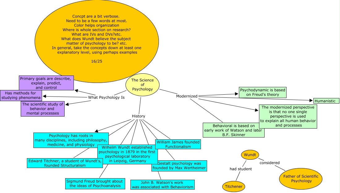 This Concept Map, created with IHMC CmapTools, has information related to: Farrone Ch.1 16, The Science of Psychology History John B. Watson's work was associated with Behaviorism, The Science of Psychology History Gestalt psychology was founded by Max Wertheimer, The Science of Psychology History Sigmund Freud brought about the ideas of Psychoanalysis, The Science of Psychology History William James founded Functionalism, The Science of Psychology History Edward Titchner, a student of Wundt's, founded Structuralism, The Science of Psychology What Psychology Is Has methods for studying phenomena, The Science of Psychology History Wilhelm Wundt established psychology in 1879 in the first psychological laboratory in Leipzig, Germany, The Science of Psychology Modernized The modernized perspective is that no one single perspective is used to explain all human behavior and processes, The Science of Psychology What Psychology Is Primary goals are describe, explain, predict, and control, The Science of Psychology Modernized Humanistic, The Science of Psychology Modernized Psychodynamic is based on Freud's theory, The Science of Psychology Modernized Behavioral is based on early work of Watson and later B.F. Skinner, The Science of Psychology History Psychology has roots in many disciplines, including philosophy, medicine, and physiology, Wundt had student Titchener, The Science of Psychology What Psychology Is The scientific study of behavior and mental processes, Wundt considered Father of Scientific Psychology