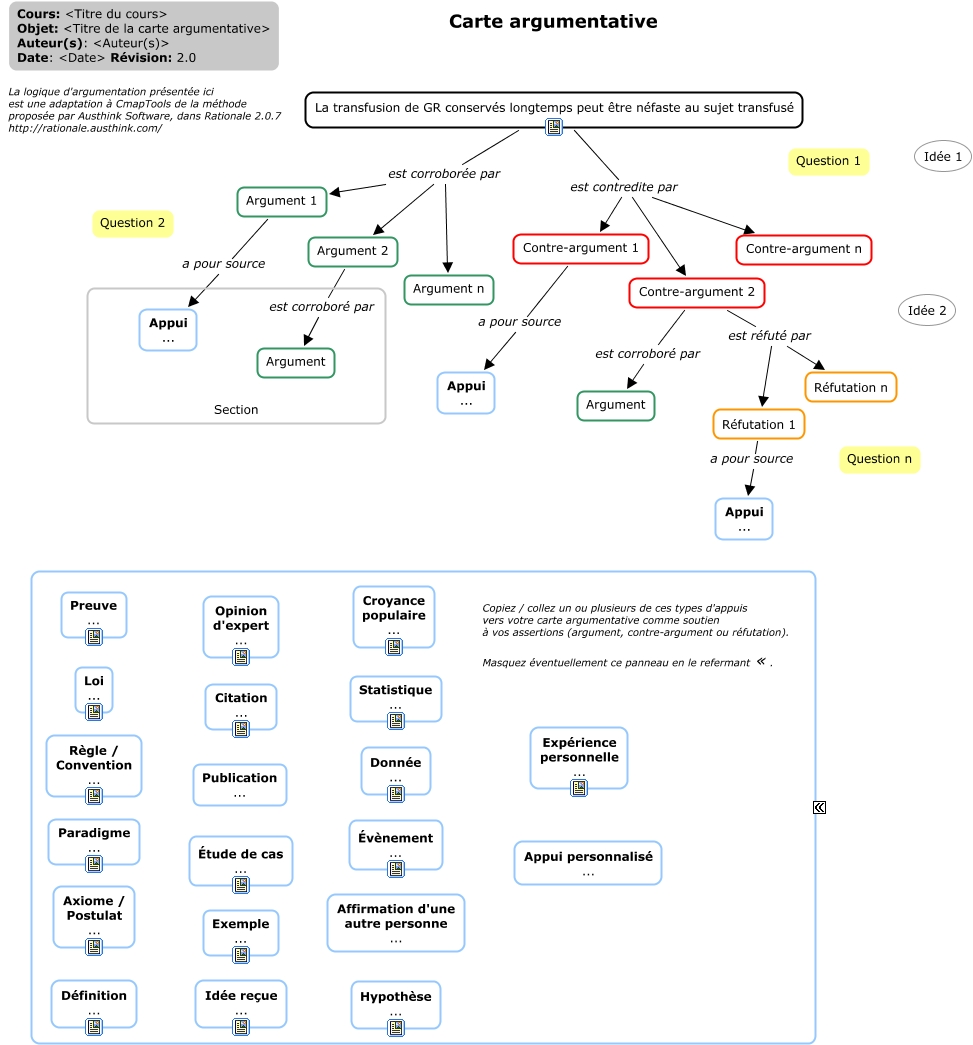 Cette carte de concepts créée avec IHMC CmapTools traite de: Carte argumentative, Contre-argument 1 a pour source Appui ..., Argument 1 a pour source Appui ..., Contre-argument 2 est réfuté par Réfutation 1, La transfusion de GR conservés longtemps peut être néfaste au sujet transfusé est corroborée par Argument n, La transfusion de GR conservés longtemps peut être néfaste au sujet transfusé est contredite par Contre-argument n, La transfusion de GR conservés longtemps peut être néfaste au sujet transfusé est corroborée par Argument 2, Contre-argument 2 est corroboré par Argument, La transfusion de GR conservés longtemps peut être néfaste au sujet transfusé est contredite par Contre-argument 2, Argument 2 est corroboré par Argument, Réfutation 1 a pour source Appui ..., Contre-argument 2 est réfuté par Réfutation n, La transfusion de GR conservés longtemps peut être néfaste au sujet transfusé est contredite par Contre-argument 1, La transfusion de GR conservés longtemps peut être néfaste au sujet transfusé est corroborée par Argument 1