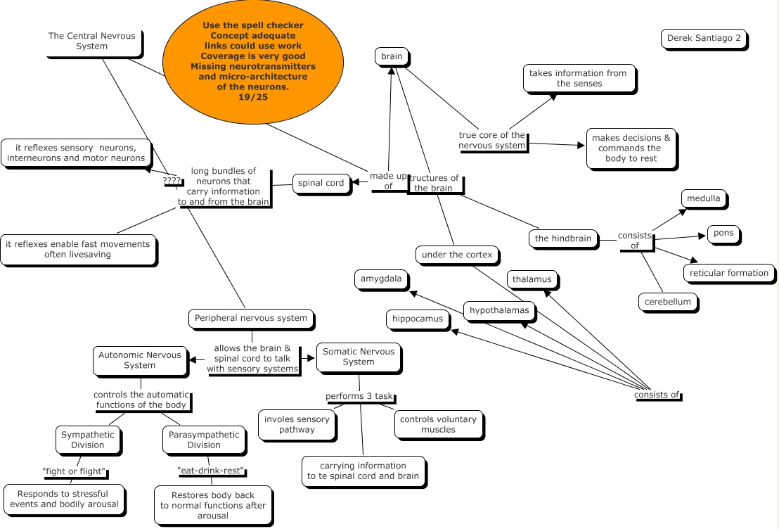 This Concept Map, created with IHMC CmapTools, has information related to: Derek Santiago Ch 2 19, Somatic Nervous System performs 3 task carrying information to te spinal cord and brain, The Central Nevrous System ???? Peripheral nervous system, under the cortex consists of thalamus, Peripheral nervous system allows the brain & spinal cord to talk with sensory systems Somatic Nervous System, the hindbrain consists of cerebellum, brain true core of the nervous system takes information from the senses, the hindbrain consists of pons, Somatic Nervous System performs 3 task involes sensory pathway, under the cortex consists of hypothalamas, brain true core of the nervous system makes decisions & commands the body to rest, the hindbrain consists of medulla, Sympathetic Division "fight or flight" Responds to stressful events and bodily arousal, Autonomic Nervous System controls the automatic functions of the body Sympathetic Division, brain structures of the brain the hindbrain, spinal cord long bundles of neurons that carry information to and from the brain it reflexes sensory neurons, interneurons and motor neurons, The Central Nevrous System made up of spinal cord, Parasympathetic Division "eat-drink-rest" Restores body back to normal functions after arousal, Autonomic Nervous System controls the automatic functions of the body Parasympathetic Division, the hindbrain consists of reticular formation, under the cortex consists of amygdala