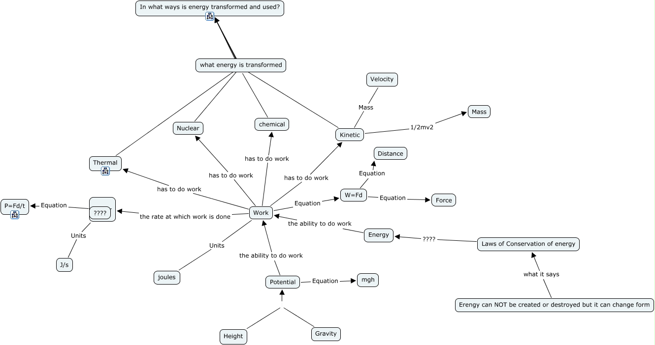 This Concept Map, created with IHMC CmapTools, has information related to: Energy Group 5, Kinetic ???? In what ways is energy transformed and used?, Nuclear ???? In what ways is energy transformed and used?, Potential the ability to do work Work, Work Equation W=Fd, Work the rate at which work is done Power, Power Units J/s, W=Fd Equation Distance, Gravity Potential, Work has to do work Nuclear, Work Units joules, W=Fd Equation Force, Potential Equation mgh, Kinetic 1/2mv2 Mass, Velocity Mass Kinetic, Height Potential, Work has to do work Kinetic, Work has to do work chemical, Work has to do work Thermal, chemical ???? In what ways is energy transformed and used?, Thermal ???? In what ways is energy transformed and used?