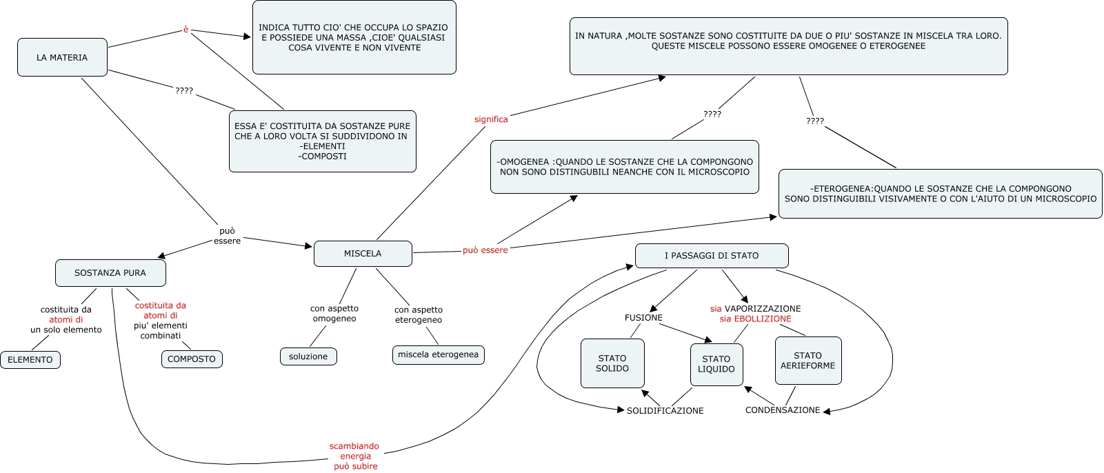 Questa Cmap, creata con IHMC CmapTools, contiene informazioni relative a: Materia, MISCELA significa IN NATURA ,MOLTE SOSTANZE SONO COSTITUITE DA DUE O PIU' SOSTANZE IN MISCELA TRA LORO. QUESTE MISCELE POSSONO ESSERE OMOGENEE O ETEROGENEE, STATO LIQUIDO sia VAPORIZZAZIONE sia EBOLLIZIONE STATO AERIEFORME, MISCELA può essere -ETEROGENEA:QUANDO LE SOSTANZE CHE LA COMPONGONO SONO DISTINGUIBILI VISIVAMENTE O CON L'AIUTO DI UN MICROSCOPIO, IN NATURA ,MOLTE SOSTANZE SONO COSTITUITE DA DUE O PIU' SOSTANZE IN MISCELA TRA LORO. QUESTE MISCELE POSSONO ESSERE OMOGENEE O ETEROGENEE ???? -ETEROGENEA:QUANDO LE SOSTANZE CHE LA COMPONGONO SONO DISTINGUIBILI VISIVAMENTE O CON L'AIUTO DI UN MICROSCOPIO, SOSTANZA PURA scambiando energia può subire I PASSAGGI DI STATO, LA MATERIA può essere MISCELA, STATO AERIEFORME CONDENSAZIONE STATO LIQUIDO, I PASSAGGI DI STATO SOLIDIFICAZIONE STATO SOLIDO, LA MATERIA è ESSA E' COSTITUITA DA SOSTANZE PURE CHE A LORO VOLTA SI SUDDIVIDONO IN -ELEMENTI -COMPOSTI, LA MATERIA può essere SOSTANZA PURA, MISCELA con aspetto eterogeneo miscela eterogenea, IN NATURA ,MOLTE SOSTANZE SONO COSTITUITE DA DUE O PIU' SOSTANZE IN MISCELA TRA LORO. QUESTE MISCELE POSSONO ESSERE OMOGENEE O ETEROGENEE ???? -OMOGENEA :QUANDO LE SOSTANZE CHE LA COMPONGONO NON SONO DISTINGUBILI NEANCHE CON IL MICROSCOPIO, LA MATERIA ???? ESSA E' COSTITUITA DA SOSTANZE PURE CHE A LORO VOLTA SI SUDDIVIDONO IN -ELEMENTI -COMPOSTI, MISCELA con aspetto omogeneo soluzione, MISCELA può essere -OMOGENEA :QUANDO LE SOSTANZE CHE LA COMPONGONO NON SONO DISTINGUBILI NEANCHE CON IL MICROSCOPIO, I PASSAGGI DI STATO sia VAPORIZZAZIONE sia EBOLLIZIONE STATO AERIEFORME, I PASSAGGI DI STATO FUSIONE STATO LIQUIDO, LA MATERIA è INDICA TUTTO CIO' CHE OCCUPA LO SPAZIO E POSSIEDE UNA MASSA ,CIOE' QUALSIASI COSA VIVENTE E NON VIVENTE, SOSTANZA PURA costituita da atomi di piu' elementi combinati COMPOSTO, I PASSAGGI DI STATO CONDENSAZIONE STATO LIQUIDO