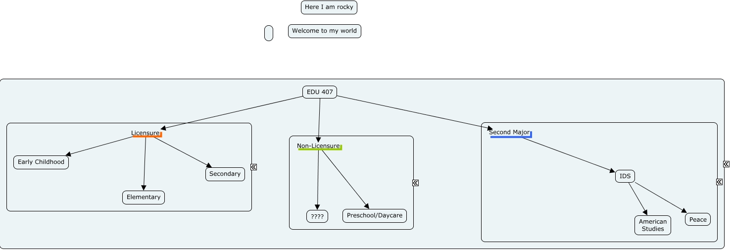 This Concept Map, created with IHMC CmapTools, has information related to: Untitled, IDS Peace, EDU 407 Licensure Elementary, EDU 407 Licensure Early Childhood, EDU 407 Non-Licensure Preschool/Daycare, IDS American Studies, EDU 407 Licensure Secondary, EDU 407 Second Major IDS, EDU 407 Non-Licensure ????