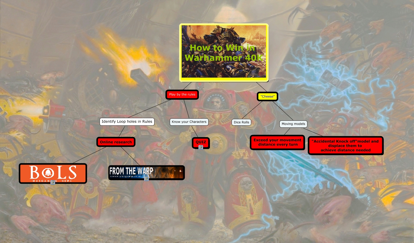 This Concept Map, created with IHMC CmapTools, has information related to: how to win in 40k, Play by the rules Identify Loop holes in Rules, "Cheese" Dice Rolls, Moving models "Accidental Knock off"model and displace them to achieve distance needed, Moving models Exceed your movement distance every turn, How to Win in Warhammer 40K Play by the rules, Play by the rules Know your Characters, Online research, How to Win in Warhammer 40K "Cheese", Know your Characters QUIZ, Online research, "Cheese" Moving models, Identify Loop holes in Rules Online research