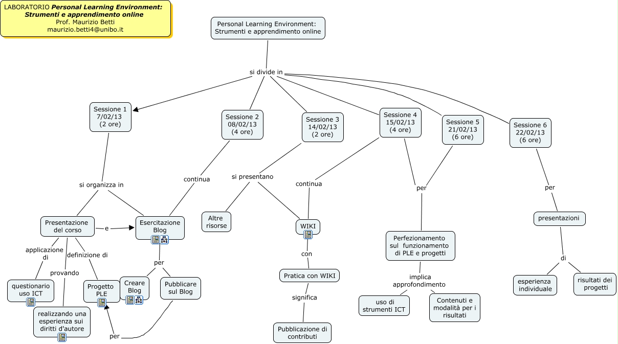 Questa Cmap, creata con IHMC CmapTools, contiene informazioni relative a: Laboratorio PLE_AA12-13, Sessione 3 14/02/13 (2 ore) si presentano WIKI, Presentazione del corso applicazione di questionario uso ICT, presentazioni di esperienza individuale, Pratica con WIKI significa Pubblicazione di contributi, Personal Learning Environment: Strumenti e apprendimento online si divide in Sessione 4 15/02/13 (4 ore), Sessione 3 14/02/13 (2 ore) si presentano Altre risorse, Personal Learning Environment: Strumenti e apprendimento online si divide in Sessione 6 22/02/13 (6 ore), Presentazione del corso provando realizzando una esperienza sui diritti d'autore, Personal Learning Environment: Strumenti e apprendimento online si divide in Sessione 2 08/02/13 (4 ore), Presentazione del corso e Esercitazione Blog, Personal Learning Environment: Strumenti e apprendimento online si divide in Sessione 1 7/02/13 (2 ore), Sessione 2 08/02/13 (4 ore) continua Esercitazione Blog, WIKI con Pratica con WIKI, Perfezionamento sul funzionamento di PLE e progetti implica approfondimento uso di strumenti ICT, Personal Learning Environment: Strumenti e apprendimento online si divide in Sessione 3 14/02/13 (2 ore), Sessione 4 15/02/13 (4 ore) per Perfezionamento sul funzionamento di PLE e progetti, Sessione 6 22/02/13 (6 ore) per presentazioni, Presentazione del corso definizione di Progetto PLE, Sessione 1 7/02/13 (2 ore) si organizza in Esercitazione Blog, Sessione 4 15/02/13 (4 ore) continua WIKI