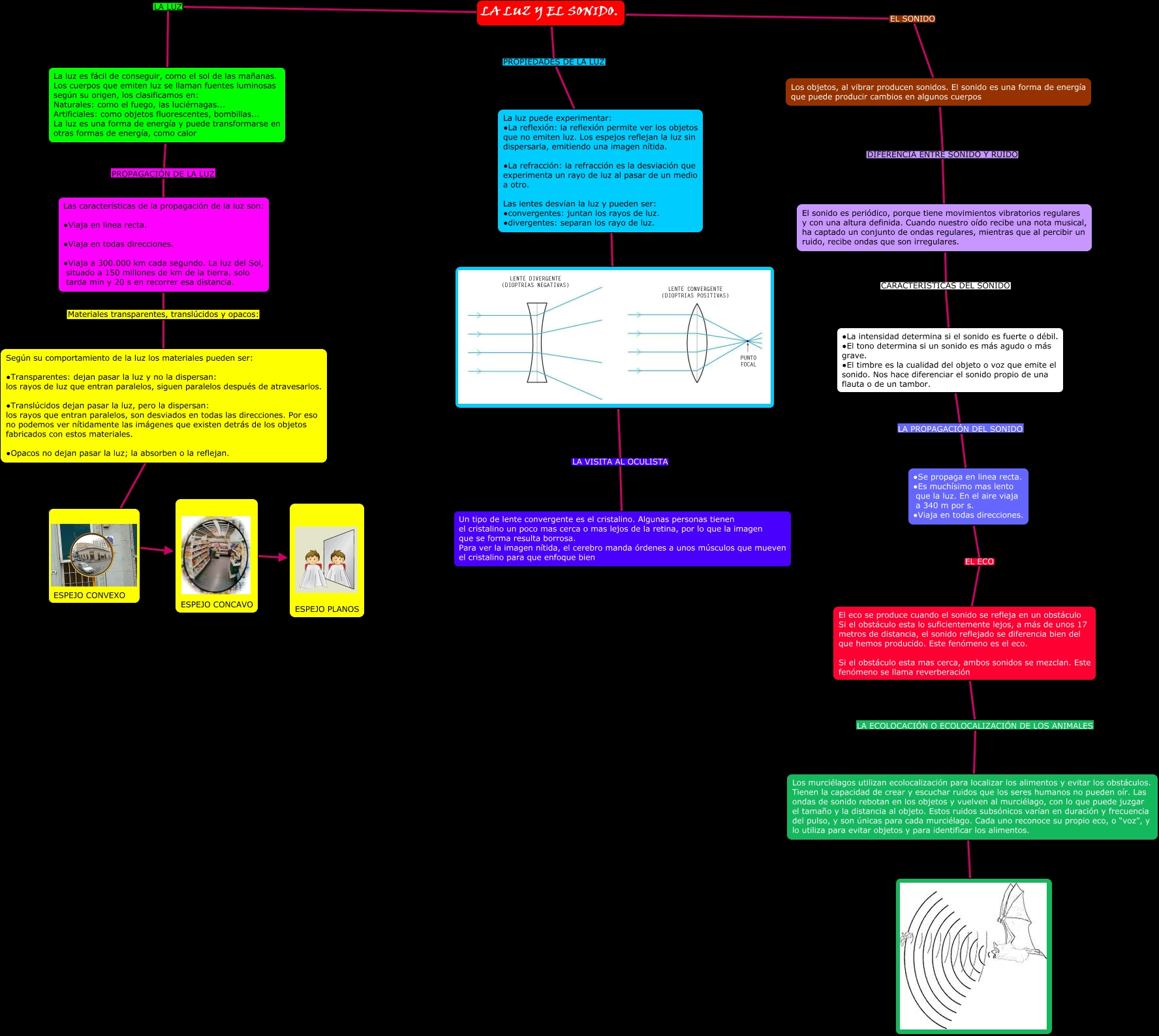 Este Cmap, tiene información relacionada con: CONO TEMA 8 VALERIA, La luz es fácil de conseguir, como el sol de las mañanas. Los cuerpos que emiten luz se llaman fuentes luminosas según su origen, los clasificamos en: Naturales: como el fuego, las luciérnagas... Artificiales: como objetos fluorescentes, bombillas... La luz es una forma de energía y puede transformarse en otras formas de energía, como calor PROPAGACIÓN DE LA LUZ Las características de la propagación de la luz son: ∙Viaja en linea recta. ∙Viaja en todas direcciones. ∙Viaja a 300.000 km cada segundo. La luz del Sol, situado a 150 millones de km de la tierra, solo tarda min y 20 s en recorrer esa distancia., LA VISITA AL OCULISTA Un tipo de lente convergente es el cristalino. Algunas personas tienen el cristalino un poco mas cerca o mas lejos de la retina, por lo que la imagen que se forma resulta borrosa. Para ver la imagen nítida, el cerebro manda órdenes a unos músculos que mueven el cristalino para que enfoque bien, La luz puede experimentar: ∙La reflexión: la reflexión permite ver los objetos que no emiten luz. Los espejos reflejan la luz sin dispersarla, emitiendo una imagen nítida. ∙La refracción: la refracción es la desviación que experimenta un rayo de luz al pasar de un medio a otro. Las lentes desvían la luz y pueden ser: ∙convergentes: juntan los rayos de luz. ∙divergentes: separan los rayo de luz. ????, ESPEJO CONCAVO ???? ESPEJO PLANOS, Las características de la propagación de la luz son: ∙Viaja en linea recta. ∙Viaja en todas direcciones. ∙Viaja a 300.000 km cada segundo. La luz del Sol, situado a 150 millones de km de la tierra, solo tarda min y 20 s en recorrer esa distancia. Materiales transparentes, translúcidos y opacos: Según su comportamiento de la luz los materiales pueden ser: ∙Transparentes: dejan pasar la luz y no la dispersan: los rayos de luz que entran paralelos, siguen paralelos después de atravesarlos. ∙Translúcidos dejan pasar la luz, pero la dispersan: los rayos que entran paralelos, son desviados en todas las direcciones. Por eso no podemos ver nítidamente las imágenes que existen detrás de los objetos fabricados con estos materiales. ∙Opacos no dejan pasar la luz; la absorben o la reflejan., Según su comportamiento de la luz los materiales pueden ser: ∙Transparentes: dejan pasar la luz y no la dispersan: los rayos de luz que entran paralelos, siguen paralelos después de atravesarlos. ∙Translúcidos dejan pasar la luz, pero la dispersan: los rayos que entran paralelos, son desviados en todas las direcciones. Por eso no podemos ver nítidamente las imágenes que existen detrás de los objetos fabricados con estos materiales. ∙Opacos no dejan pasar la luz; la absorben o la reflejan. ???? ESPEJO CONVEXO, El eco se produce cuando el sonido se refleja en un obstáculo Si el obstáculo esta lo suficientemente lejos, a más de unos 17 metros de distancia, el sonido reflejado se diferencia bien del que hemos producido. Este fenómeno es el eco. Si el obstáculo esta mas cerca, ambos sonidos se mezclan. Este fenómeno se llama reverberación LA ECOLOCACIÓN O ECOLOCALIZACIÓN DE LOS ANIMALES Los murciélagos utilizan ecolocalización para localizar los alimentos y evitar los obstáculos. Tienen la capacidad de crear y escuchar ruidos que los seres humanos no pueden oír. Las ondas de sonido rebotan en los objetos y vuelven al murciélago, con lo que puede juzgar el tamaño y la distancia al objeto. Estos ruidos subsónicos varían en duración y frecuencia del pulso, y son únicas para cada murciélago. Cada uno reconoce su propio eco, o “voz”, y lo utiliza para evitar objetos y para identificar los alimentos., LA LUZ Y EL SONIDO. LA LUZ La luz es fácil de conseguir, como el sol de las mañanas. Los cuerpos que emiten luz se llaman fuentes luminosas según su origen, los clasificamos en: Naturales: como el fuego, las luciérnagas... Artificiales: como objetos fluorescentes, bombillas... La luz es una forma de energía y puede transformarse en otras formas de energía, como calor, LA LUZ Y EL SONIDO. EL SONIDO Los objetos, al vibrar producen sonidos. El sonido es una forma de energía que puede producir cambios en algunos cuerpos, ESPEJO CONVEXO ???? ESPEJO CONCAVO, ∙Se propaga en linea recta. ∙Es muchísimo mas lento que la luz. En el aire viaja a 340 m por s. ∙Viaja en todas direcciones. EL ECO El eco se produce cuando el sonido se refleja en un obstáculo Si el obstáculo esta lo suficientemente lejos, a más de unos 17 metros de distancia, el sonido reflejado se diferencia bien del que hemos producido. Este fenómeno es el eco. Si el obstáculo esta mas cerca, ambos sonidos se mezclan. Este fenómeno se llama reverberación, Los objetos, al vibrar producen sonidos. El sonido es una forma de energía que puede producir cambios en algunos cuerpos DIFERENCIA ENTRE SONIDO Y RUIDO El sonido es periódico, porque tiene movimientos vibratorios regulares y con una altura definida. Cuando nuestro oído recibe una nota musical, ha captado un conjunto de ondas regulares, mientras que al percibir un ruido, recibe ondas que son irregulares., Los murciélagos utilizan ecolocalización para localizar los alimentos y evitar los obstáculos. Tienen la capacidad de crear y escuchar ruidos que los seres humanos no pueden oír. Las ondas de sonido rebotan en los objetos y vuelven al murciélago, con lo que puede juzgar el tamaño y la distancia al objeto. Estos ruidos subsónicos varían en duración y frecuencia del pulso, y son únicas para cada murciélago. Cada uno reconoce su propio eco, o “voz”, y lo utiliza para evitar objetos y para identificar los alimentos. ????, El sonido es periódico, porque tiene movimientos vibratorios regulares y con una altura definida. Cuando nuestro oído recibe una nota musical, ha captado un conjunto de ondas regulares, mientras que al percibir un ruido, recibe ondas que son irregulares. CARACTERISTICAS