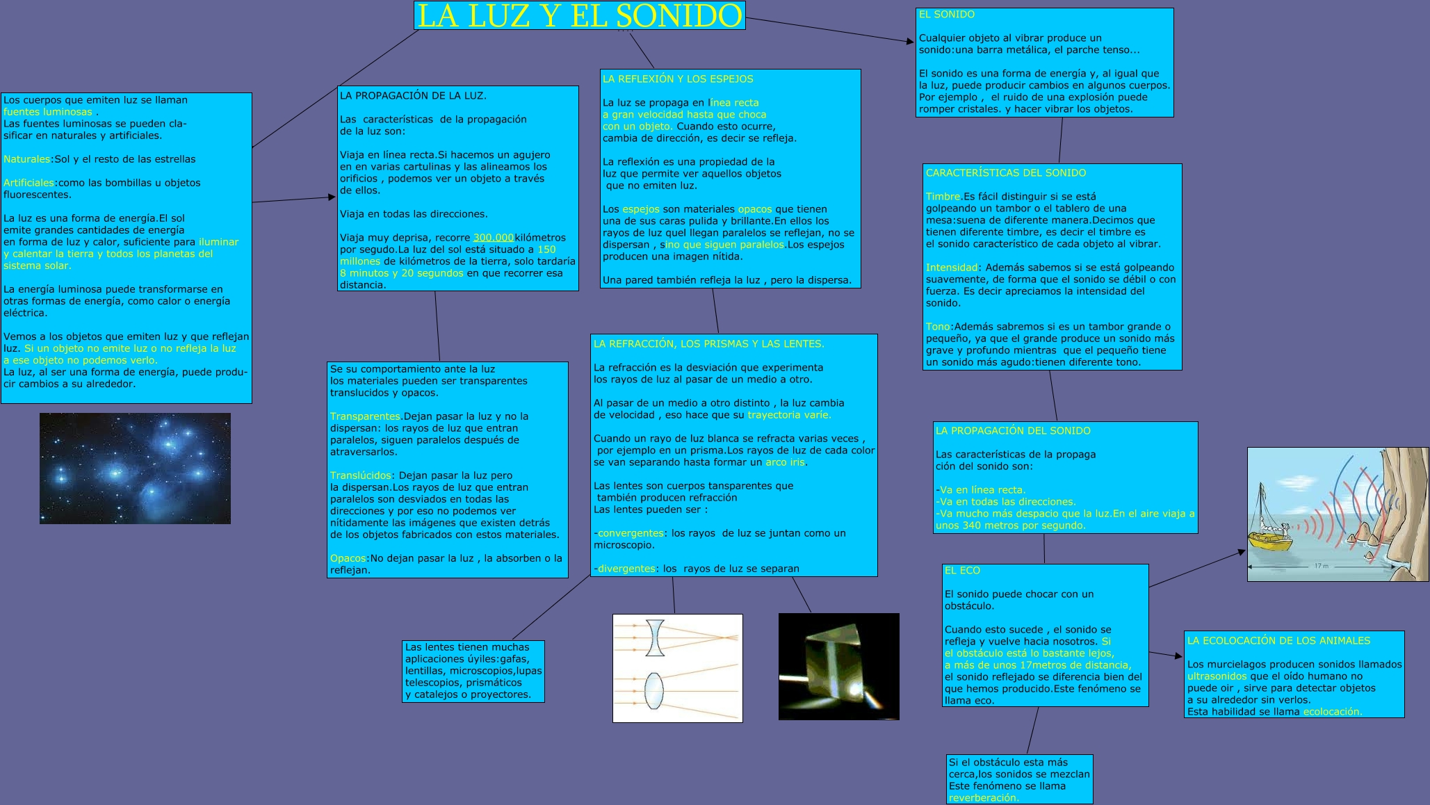 Este Cmap, tiene información relacionada con: JORGE 8, LA LUZ Y EL SONIDO ???? Los cuerpos que emiten luz se llaman fuentes luminosas . Las fuentes luminosas se pueden cla- sificar en naturales y artificiales. Naturales:Sol y el resto de las estrellas Artificiales:como las bombillas u objetos fluorescentes. La luz es una forma de energía.El sol emite grandes cantidades de energía en forma de luz y calor, suficiente para iluminar y calentar la tierra y todos los planetas del sistema solar. La energía luminosa puede transformarse en otras formas de energía, como calor o energía eléctrica. Vemos a los objetos que emiten luz y que reflejan luz. Si un objeto no emite luz o no refleja la luz a ese objeto no podemos verlo. La luz, al ser una forma de energía, puede produ- cir cambios a su alrededor., EL SONIDO Cualquier objeto al vibrar produce un sonido:una barra metálica, el parche tenso... El sonido es una forma de energía y, al igual que la luz, puede producir cambios en algunos cuerpos. Por ejemplo , el ruido de una explosión puede romper cristales. y hacer vibrar los objetos. ???? CARACTERÍSTICAS DEL SONIDO Timbre.Es fácil distinguir si se está golpeando un tambor o el tablero de una mesa:suena de diferente manera.Decimos que tienen diferente timbre, es decir el timbre es el sonido característico de cada objeto al vibrar. Intensidad: Además sabemos si se está golpeando suavemente, de forma que el sonido se débil o con fuerza. Es decir apreciamos la intensidad del sonido. Tono:Además sabremos si es un tambor grande o pequeño, ya que el grande produce un sonido más grave y profundo mientras que el pequeño tiene un sonido más agudo:tienen diferente tono., LA REFRACCIÓN, LOS PRISMAS Y LAS LENTES. La refracción es la desviación que experimenta los rayos de luz al pasar de un medio a otro. Al pasar de un medio a otro distinto , la luz cambia de velocidad , eso hace que su trayectoria varíe. Cuando un rayo de luz blanca se refracta varias veces , por ejemplo en un prisma.Los rayos de luz de cada color se van separando hasta formar un arco iris. Las lentes son cuerpos tansparentes que también producen refracción Las lentes pueden ser : -convergentes: los rayos de luz se juntan como un microscopio. -divergentes: los rayos de luz se separan ????, LA REFRACCIÓN, LOS PRISMAS Y LAS LENTES. La refracción es la desviación que experimenta los rayos de luz al pasar de un medio a otro. Al pasar de un medio a otro distinto , la luz cambia de velocidad , eso hace que su trayectoria varíe. Cuando un rayo de luz blanca se refracta varias veces , por ejemplo en un prisma.Los rayos de luz de cada color se van separando hasta formar un arco iris. Las lentes son cuerpos tansparentes que también producen refracción Las lentes pueden ser : -convergentes: los rayos de luz se juntan como un microscopio. -divergentes: los rayos de luz se separan ???? Las lentes tienen muchas aplicaciones úyiles:gafas, lentillas, microscopios,lupas telescopios, prismáticos y catalejos o proyectores., EL ECO El sonido puede chocar con un obstáculo. Cuando esto sucede , el sonido se refleja y vuelve hacia nosotros. Si el obstáculo está lo bastante lejos, a más de unos 17metros de distancia, el sonido reflejado se diferencia bien del que hemos producido.Este fenómeno se llama eco. ???? LA ECOLOCACIÓN DE LOS ANIMALES Los murcielagos producen sonidos llamados ultrasonidos que el oído humano no puede oir , sirve para detectar objetos a su alrededor sin verlos. Esta habilidad se llama ecolocación., Los cuerpos que emiten luz se llaman fuentes luminosas . Las fuentes luminosas se pueden cla- sificar en naturales y artificiales. Naturales:Sol y el resto de las estrellas Artificiales:como las bombillas u objetos fluorescentes. La luz es una forma de energía.El sol emite grandes cantidades de energía en forma de luz y calor, suficiente para iluminar y calentar la tierra y todos los planetas del sistema solar. La energía luminosa puede transformarse en otras formas de energía, como calor o energía eléctrica. Vemos a los objetos que emiten luz y que reflejan luz. Si un objeto no emite luz o no refleja la luz a ese objeto no podemos verlo. La luz, al ser una forma de energía, puede produ- cir cambios a su alrededor. ???? LA PROPAGACIÓN DE LA LUZ. Las características de la propagación de la luz son: Viaja en línea recta.Si hacemos un agujero en en varias cartulinas y las alineamos los orificios , podemos ver un objeto a través de ellos. Viaja en todas las direcciones. Viaja muy deprisa, recorre 300.000kilómetros por segudo.La luz del sol está situado a 150 millones de kilómetros de la tierra, solo tardaría 8 minutos y 20 segundos en que recorrer esa distancia., EL ECO El sonido puede chocar con un obstáculo. Cuando esto sucede , el sonido se refleja y vuelve hacia nosotros. Si el obstáculo está lo bastante lejos, a más de unos 17metros de distancia, el sonido reflejado se diferencia bien del que hemos producido.Este fenómeno se llama eco. ???? Si el obstáculo esta más cerca,los sonidos se mezclan Este fenómeno se llama reverberación., LA LUZ Y EL SONIDO ???? LA REFLEXIÓN Y LOS ESPEJOS La luz se propaga en línea recta a gran velocidad hasta que choca con un objeto. Cuando esto ocurre, cambia de dirección, es decir se refleja. La reflexión es una propiedad de la luz que permite ver aquellos objetos que no emiten luz. Los espejos son materiales opacos que tienen una de sus caras pulida y brillante.En ellos los rayos de luz quel llegan paralelos se reflejan, no se dispersan , sino que siguen paralelos.Los espejos producen una imagen nítida. Una pared también refleja la luz , pero la dispersa., LA PROPAGACIÓN DEL SONIDO Las características de la propaga ción del sonido son: -Va en línea recta. -Va en todas las direcciones. -Va mucho más despacio que la luz.En el aire viaja a unos 340 metros por segundo. ???? EL ECO El sonido puede chocar con un obstáculo. Cuando esto sucede ,