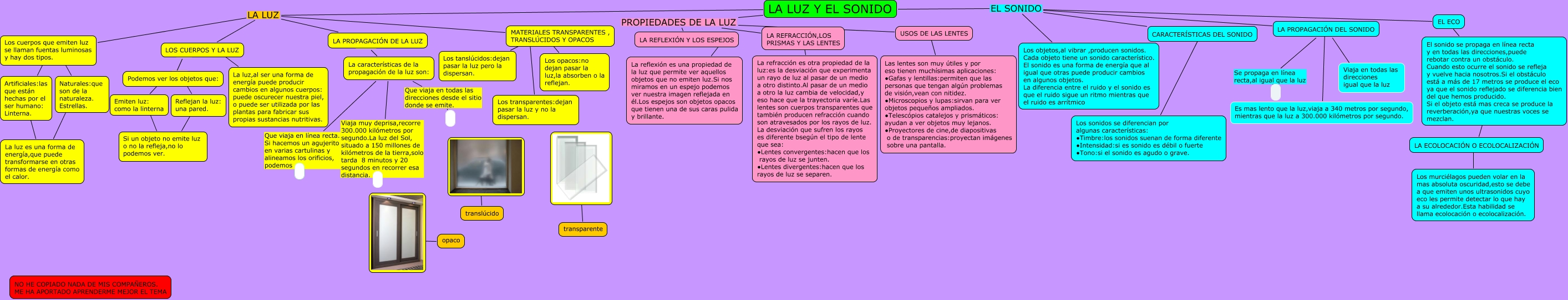 Este Cmap, tiene información relacionada con: cono tema 8, Podemos ver los objetos que: ???? Emiten luz: como la linterna, EL ECO ???? El sonido se propaga en línea recta y en todas las direcciones,puede rebotar contra un obstáculo. Cuando esto ocurre el sonido se refleja y vuelve hacia nosotros.Si el obstáculo está a más de 17 metros se produce el eco ya que el sonido reflejado se diferencia bien del que hemos producido. Si el objeto está mas creca se produce la reverberación,ya que nuestras voces se mezclan., LA PROPAGACIÓN DE LA LUZ ???? La características de la propagación de la luz son:, LA REFRACCIÓN,LOS PRISMAS Y LAS LENTES ???? La refracción es otra propiedad de la luz:es la desviación que experimenta un rayo de luz al pasar de un medio a otro distinto.Al pasar de un medio a otro la luz cambia de velocidad,y eso hace que la trayectoria varíe.Las lentes son cuerpos transparentes que también producen refracción cuando son atravesados por los rayos de luz. La desviación que sufren los rayos es diferente bsegún el tipo de lente que sea: ∙Lentes convergentes:hacen que los rayos de luz se junten. ∙Lentes divergentes:hacen que los rayos de luz se separen., Reflejan la luz: una pared. ???? Si un objeto no emite luz o no la refleja,no lo podemos ver., Naturales:que son de la naturaleza. Estrellas. ???? La luz es una forma de energía,que puede transformarse en otras formas de energía como el calor., LA PROPAGACIÓN DEL SONIDO Se propaga en línea recta,al igual que la luz, ???? opaco, LA LUZ Y EL SONIDO LA LUZ LOS CUERPOS Y LA LUZ, La características de la propagación de la luz son: Que viaja en línea recta. Si hacemos un agujerito en varias cartulinas y alineamos los orificios, podemos, LA PROPAGACIÓN DEL SONIDO ???? Es mas lento que la luz,viaja a 340 metros por segundo, mientras que la luz a 300.000 kilómetros por segundo., LA LUZ Y EL SONIDO LA LUZ LA PROPAGACIÓN DE LA LUZ, LA LUZ Y EL SONIDO PROPIEDADES DE LA LUZ USOS DE LAS LENTES, LA LUZ Y EL SONIDO EL SONIDO Los objetos,al vibrar ,producen sonidos. Cada objeto tiene un sonido característico. El sonido es una forma de energía que al igual que otras puede producir cambios en algunos objetos. La diferencia entre el ruido y el sonido es que el ruido sigue un ritmo mientras que el ruido es arrítmico, LA LUZ Y EL SONIDO EL SONIDO EL ECO, Artificiales:las que están hechas por el ser humano: Linterna. ???? La luz es una forma de energía,que puede transformarse en otras formas de energía como el calor., LA ECOLOCACIÓN O ECOLOCALIZACIÓN ???? El sonido se propaga en línea recta y en todas las direcciones,puede rebotar contra un obstáculo. Cuando esto ocurre el sonido se refleja y vuelve hacia nosotros.Si el obstáculo está a más de 17 metros se produce el eco ya que el sonido reflejado se diferencia bien del que hemos producido. Si el objeto está mas creca se produce la reverberación,ya que nuestras voces se mezclan., Los cuerpos que emiten luz se llaman fuentas luminosas y hay dos tipos. ???? Naturales:que son de la naturaleza. Estrellas., LOS CUERPOS Y LA LUZ ???? La luz,al ser una forma de energía puede producir cambios en algunos cuerpos: puede oscurecer nuestra piel, o puede ser utilizada por las plantas para fabricar sus propias sustancias nutritivas., LA LUZ Y EL SONIDO EL SONIDO CARACTERÍSTICAS DEL SONIDO
