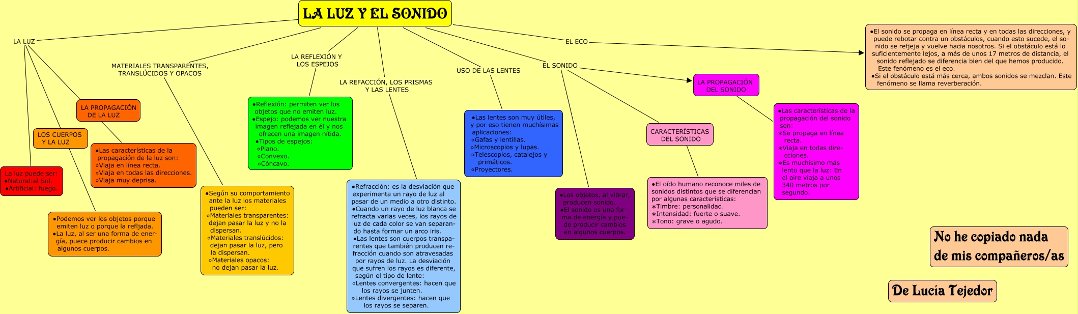 Este Cmap, tiene información relacionada con: Lucia tema 8 cono, CARACTERÍSTICAS DEL SONIDO ???? ∙El oído humano reconoce miles de sonidos distintos que se diferencian por algunas características: ∗Timbre: personalidad. ∗Intensidad: fuerte o suave. ∗Tono: grave o agudo., LA LUZ Y EL SONIDO MATERIALES TRANSPARENTES, TRANSLÚCIDOS Y OPACOS ∙Según su comportamiento ante la luz los materiales pueden ser: ∘Materiales transparentes: dejan pasar la luz y no la dispersan. ∘Materiales translúcidos: dejan pasar la luz, pero la dispersan. ∘Materiales opacos: no dejan pasar la luz., LA LUZ Y EL SONIDO EL SONIDO CARACTERÍSTICAS DEL SONIDO, LA LUZ Y EL SONIDO EL SONIDO ∙Los objetos, al vibrar, producen sonido. ∙El sonido es una for- ma de energía y pue- de producir cambios en algunos cuerpos., LA LUZ Y EL SONIDO EL SONIDO LA PROPAGACIÓN DEL SONIDO, LA LUZ Y EL SONIDO LA LUZ La luz puede ser: ∙Natural:el Sol. ∙Artificial: fuego., LA LUZ Y EL SONIDO USO DE LAS LENTES ∙Las lentes son muy útiles, y por eso tienen muchísimas aplicaciones: ∘Gafas y lentillas. ∘Microscopios y lupas. ∘Telescopios, catalejos y primáticos. ∘Proyectores., LA LUZ Y EL SONIDO LA LUZ ∙Podemos ver los objetos porque emiten luz o porque la refljada. ∙La luz, al ser una forma de ener- gía, puece producir cambios en algunos cuerpos., LA LUZ Y EL SONIDO EL ECO ∙El sonido se propaga en línea recta y en todas las direcciones, y puede rebotar contra un obstáculos, cuando esto sucede, el so- nido se refjeja y vuelve hacia nosotros. Si el obstáculo está lo suficientemente lejos, a más de unos 17 metros de distancia, el sonido reflejado se diferencia bien del que hemos producido. Este fenómeno es el eco. ∙Si el obstáculo está más cerca, ambos sonidos se mezclan. Este fenómeno se llama reverberación., LA PROPAGACIÓN DEL SONIDO ???? ∙Las características de la propagación del sonido son: ∗Se propaga en línea recta. ∗Viaja en todas dire- cciones. ∗Es muchísimo más lento que la luz: En el aire viaja a unos 340 metros por segundo., LA LUZ Y EL SONIDO LA LUZ ∙Las características de la propagación de la luz son: ∘Viaja en línea recta. ∘Viaja en todas las direcciones. ∘Viaja muy deprisa., LA LUZ Y EL SONIDO LA REFLEXIÓN Y LOS ESPEJOS ∙Reflexión: permiten ver los objetos que no emiten luz. ∙Espejo: podemos ver nuestra imagen reflejada en él y nos ofrecen una imagen nítida. ∙Tipos de espejos: ∘Plano. ∘Convexo. ∘Cóncavo., LA LUZ Y EL SONIDO LA REFACCIÓN, LOS PRISMAS Y LAS LENTES ∙Refracción: es la desviación que experimenta un rayo de luz al pasar de un medio a otro distinto. ∙Cuando un rayo de luz blanca se refracta varias veces, los rayos de luz de cada color se van separan- do hasta formar un arco iris. ∙Las lentes son cuerpos transpa- rentes que también producen re- fracción cuando son atravesadas por rayos de luz. La desviación que sufren los rayos es diferente, según el tipo de lente: ∘Lentes convergentes: hacen que los rayos se junten. ∘Lentes divergentes: hacen que los rayos se separen.