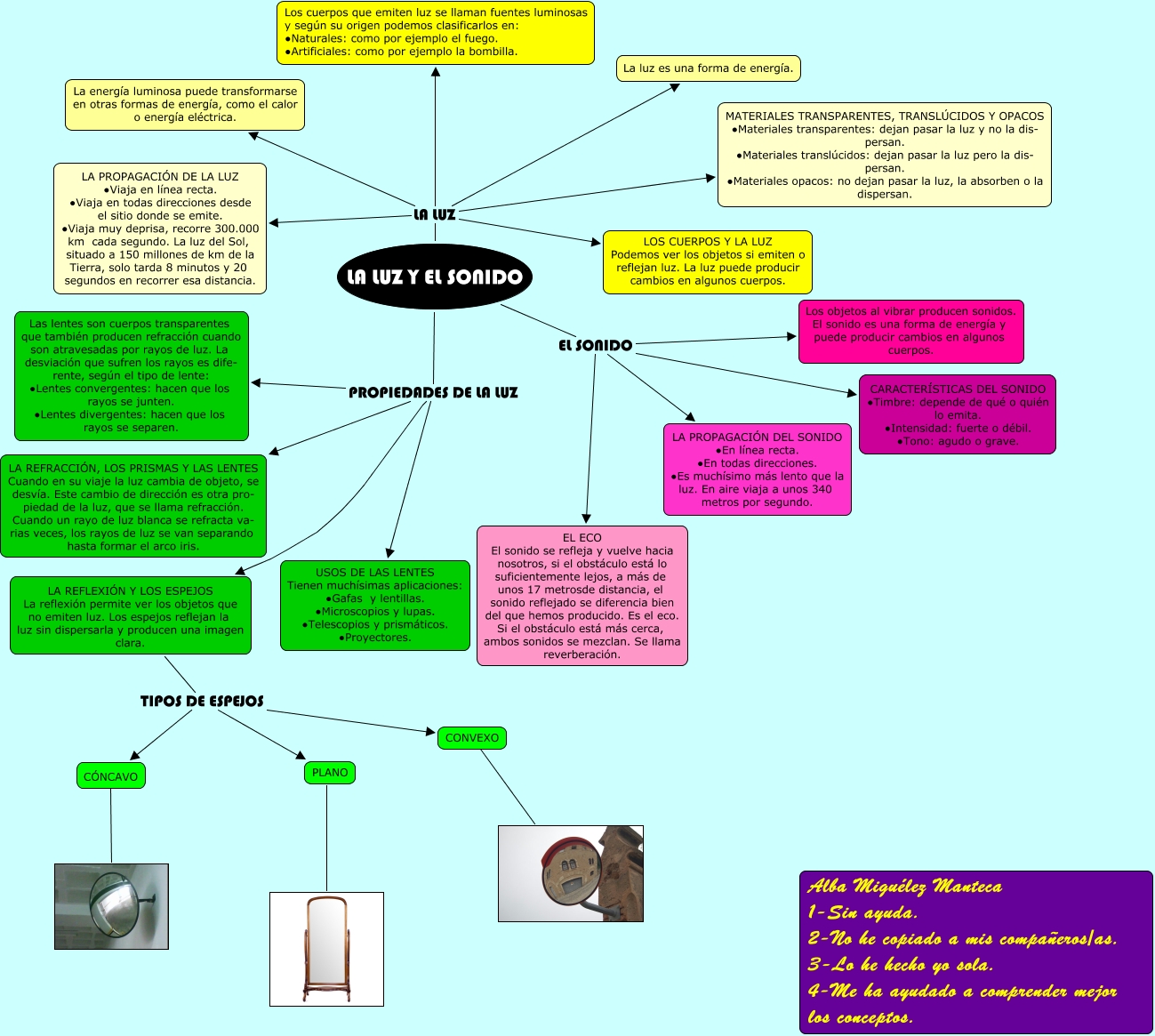 Este Cmap, tiene información relacionada con: CONO TEMA 8 ALBA, CONVEXO ????, LA LUZ Y EL SONIDO EL SONIDO CARACTERÍSTICAS DEL SONIDO ∙Timbre: depende de qué o quién lo emita. ∙Intensidad: fuerte o débil. ∙Tono: agudo o grave., LA REFLEXIÓN Y LOS ESPEJOS La reflexión permite ver los objetos que no emiten luz. Los espejos reflejan la luz sin dispersarla y producen una imagen clara. TIPOS DE ESPEJOS CONVEXO, CÓNCAVO ????, LA LUZ Y EL SONIDO EL SONIDO LA PROPAGACIÓN DEL SONIDO ∙En línea recta. ∙En todas direcciones. ∙Es muchísimo más lento que la luz. En aire viaja a unos 340 metros por segundo., LA LUZ Y EL SONIDO LA LUZ Los cuerpos que emiten luz se llaman fuentes luminosas y según su origen podemos clasificarlos en: ∙Naturales: como por ejemplo el fuego. ∙Artificiales: como por ejemplo la bombilla., LA LUZ Y EL SONIDO LA LUZ La luz es una forma de energía., LA LUZ Y EL SONIDO PROPIEDADES DE LA LUZ LA REFRACCIÓN, LOS PRISMAS Y LAS LENTES Cuando en su viaje la luz cambia de objeto, se desvía. Este cambio de dirección es otra pro- piedad de la luz, que se llama refracción. Cuando un rayo de luz blanca se refracta va- rias veces, los rayos de luz se van separando hasta formar el arco iris., LA LUZ Y EL SONIDO LA LUZ MATERIALES TRANSPARENTES, TRANSLÚCIDOS Y OPACOS ∙Materiales transparentes: dejan pasar la luz y no la dis- persan. ∙Materiales translúcidos: dejan pasar la luz pero la dis- persan. ∙Materiales opacos: no dejan pasar la luz, la absorben o la dispersan., LA LUZ Y EL SONIDO LA LUZ LA PROPAGACIÓN DE LA LUZ ∙Viaja en línea recta. ∙Viaja en todas direcciones desde el sitio donde se emite. ∙Viaja muy deprisa, recorre 300.000 km cada segundo. La luz del Sol, situado a 150 millones de km de la Tierra, solo tarda 8 minutos y 20 segundos en recorrer esa distancia., LA REFLEXIÓN Y LOS ESPEJOS La reflexión permite ver los objetos que no emiten luz. Los espejos reflejan la luz sin dispersarla y producen una imagen clara. TIPOS DE ESPEJOS CÓNCAVO, LA REFLEXIÓN Y LOS ESPEJOS La reflexión permite ver los objetos que no emiten luz. Los espejos reflejan la luz sin dispersarla y producen una imagen clara. TIPOS DE ESPEJOS PLANO, LA LUZ Y EL SONIDO PROPIEDADES DE LA LUZ LA REFLEXIÓN Y LOS ESPEJOS La reflexión permite ver los objetos que no emiten luz. Los espejos reflejan la luz sin dispersarla y producen una imagen clara., LA LUZ Y EL SONIDO PROPIEDADES DE LA LUZ Las lentes son cuerpos transparentes que también producen refracción cuando son atravesadas por rayos de luz. La desviación que sufren los rayos es dife- rente, según el tipo de lente: ∙Lentes convergentes: hacen que los rayos se junten. ∙Lentes divergentes: hacen que los rayos se separen., LA LUZ Y EL SONIDO LA LUZ LOS CUERPOS Y LA LUZ Podemos ver los objetos si emiten o reflejan luz. La luz puede producir cambios en algunos cuerpos., LA LUZ Y EL SONIDO EL SONIDO Los objetos al vibrar producen sonidos. El sonido es una forma de energía y puede producir cambios en algunos cuerpos., LA LUZ Y EL SONIDO EL SONIDO EL ECO El sonido se refleja y vuelve hacia nosotros, si el obstáculo está lo suficientemente lejos, a más de unos 17 metrosde distancia, el sonido reflejado se diferencia bien del que hemos producido. Es el eco. Si el obstáculo está más cerca, ambos sonidos se mezclan. Se llama reverberación., PLANO ????, LA LUZ Y EL SONIDO PROPIEDADES DE LA LUZ USOS DE LAS LENTES Tienen muchísimas aplicaciones: ∙Gafas y lentillas. ∙Microscopios y lupas. ∙Telescopios y prismáticos. ∙Proyectores., LA LUZ Y EL SONIDO LA LUZ La energía luminosa puede transformarse en otras formas de energía, como el calor o energía eléctrica.