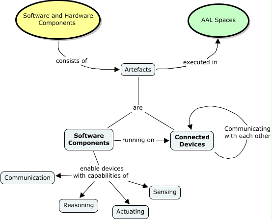 Este Cmap, tiene información relacionada con: HWSWComponents, Software Components enable devices with capabilities of Sensing, Software and Hardware Components consists of Artefacts, Software Components enable devices with capabilities of Communication, Artefacts are Connected Devices, Software Components enable devices with capabilities of Reasoning, Artefacts are Software Components, Software Components enable devices with capabilities of Actuating, Software Components running on Connected Devices, Artefacts executed in AAL Spaces