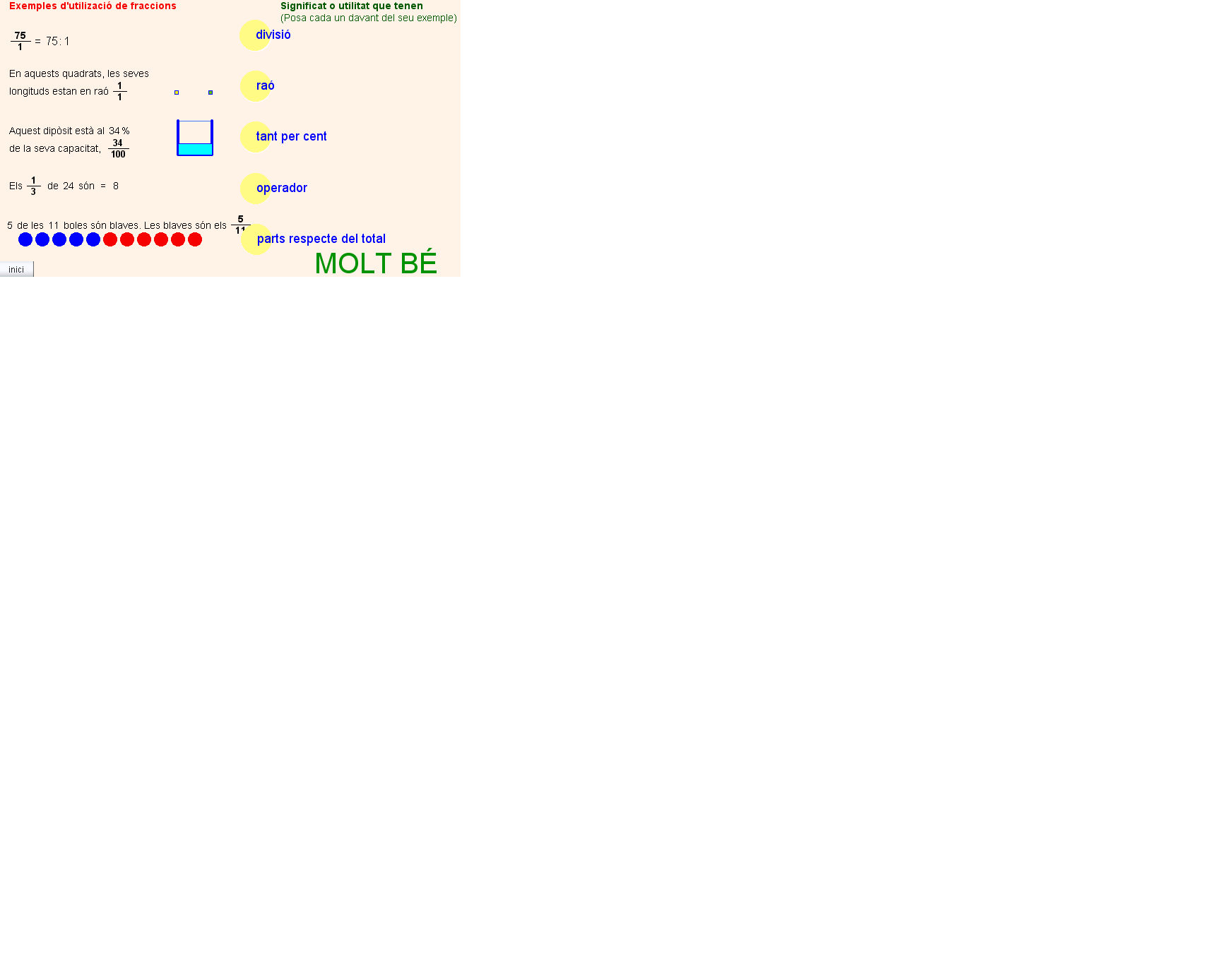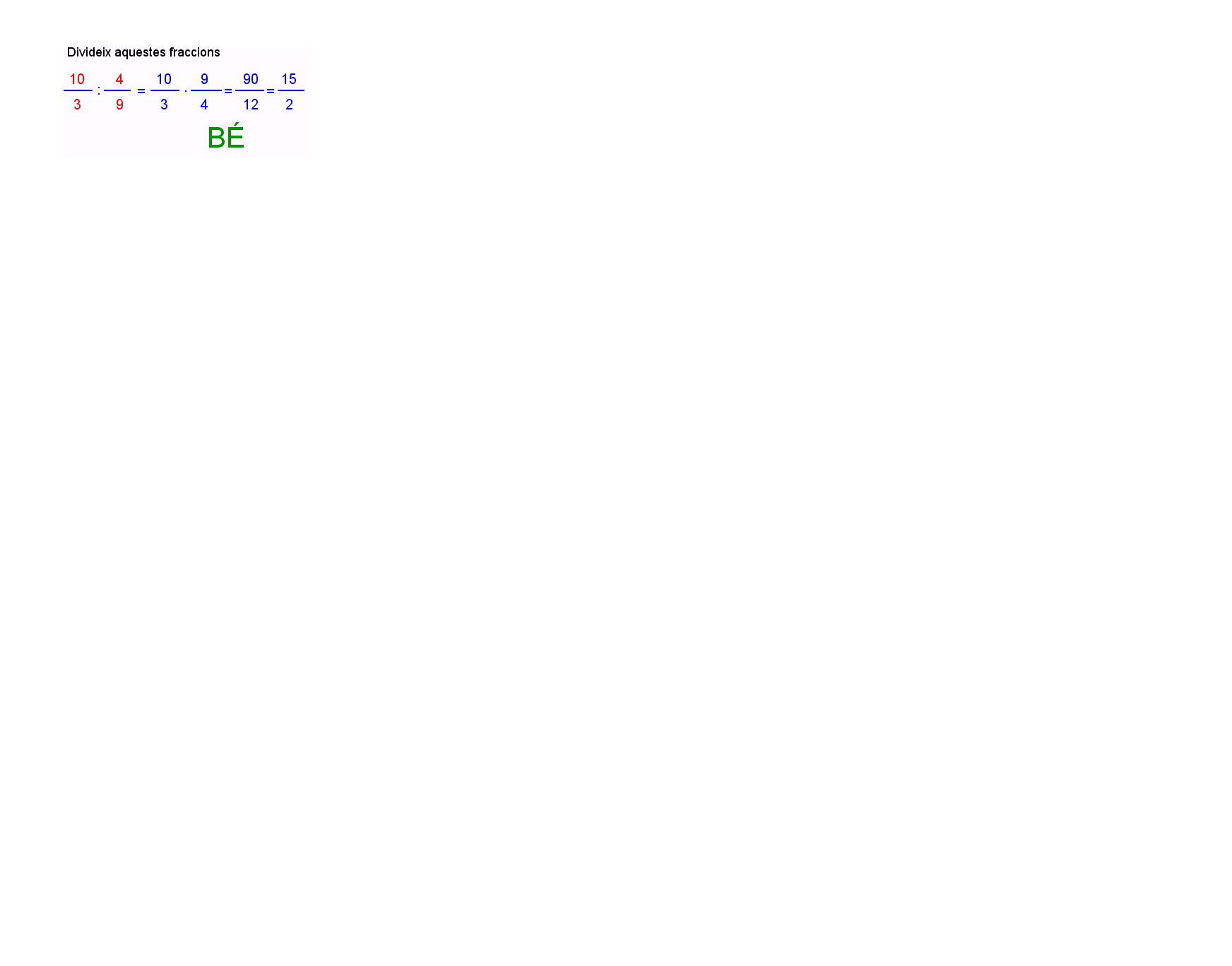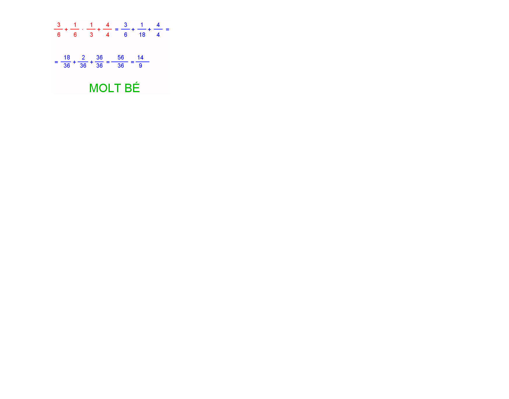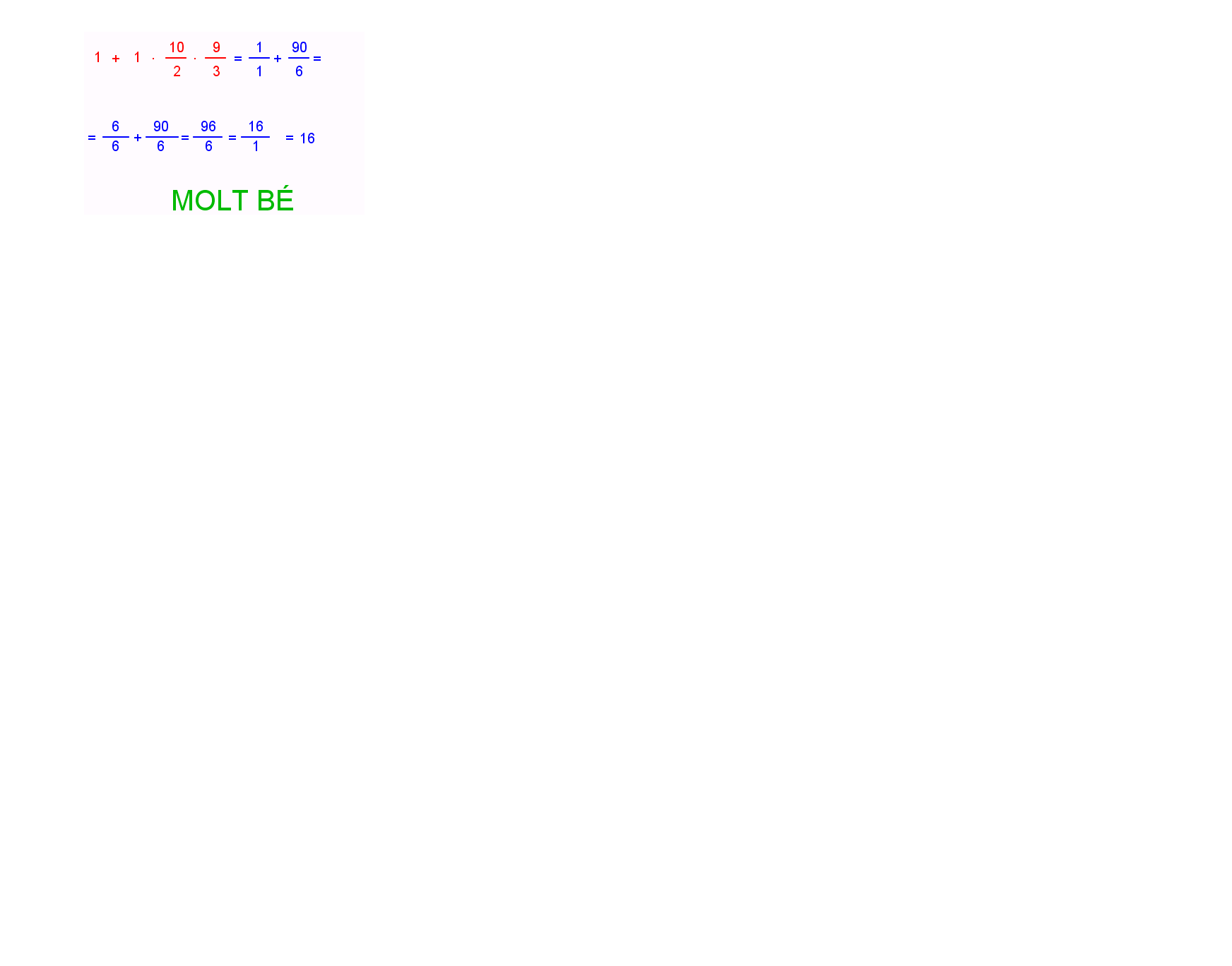 5.1.1 Les fraccions a la nostra vida quotidiana.png 5.1.2 Elements d'una fracció.png 5.1.3 Com es llegeix una fracció.png 5.1.4 Valor d'una fracció.png 5.1.5 De fracció a decimal.png 5.2.1a) Fraccions equivalents.png 5.2.1b) Fraccions equivalents.png 5.2.2 Productes creuats.png 5.2.3a) Simplificar una fracció.png 5.2.3b) Simplificar una fracció.png 5.3.1 Passar fracions a comú denominador.png 5.3.2a) Suma de fraccions.png 5.3.2b) Suma de fraccions.png 5.3.3a) Suma i resta de fraccions.png 5.3.3b) Suma i resta de fraccions.png 5.3.4 Multiplicació de fraccions.png 5.3.5 Fracció inversa d'una fracció.png 5.3.6 Divisió de fraccions.png 5.3.7(1) Operacions combinades.png 5.3.7(10) Operacions combinades.png 5.3.7(2) Operacions combinades.png 5.3.7(3) Operacions combinades.png 5.3.7(4) Operacions combinades.png 5.3.7(5) Operacions combinades.png 5.3.7(6) Operacions combinades.png 5.3.7(7) Operacions combinades.png 5.3.7(8) Operacions combinades.png 5.3.7(9) Operacions combinades.png 5.3.7 Operacions combinades.png Com es llegeix una fracció.png Elements d'una fracció.png Les fraccions.png Tema 5. Exercicis.cmap tema5 autovaluació.png tema5 enviar al tutor.png Tema 5 fraccions.cmap