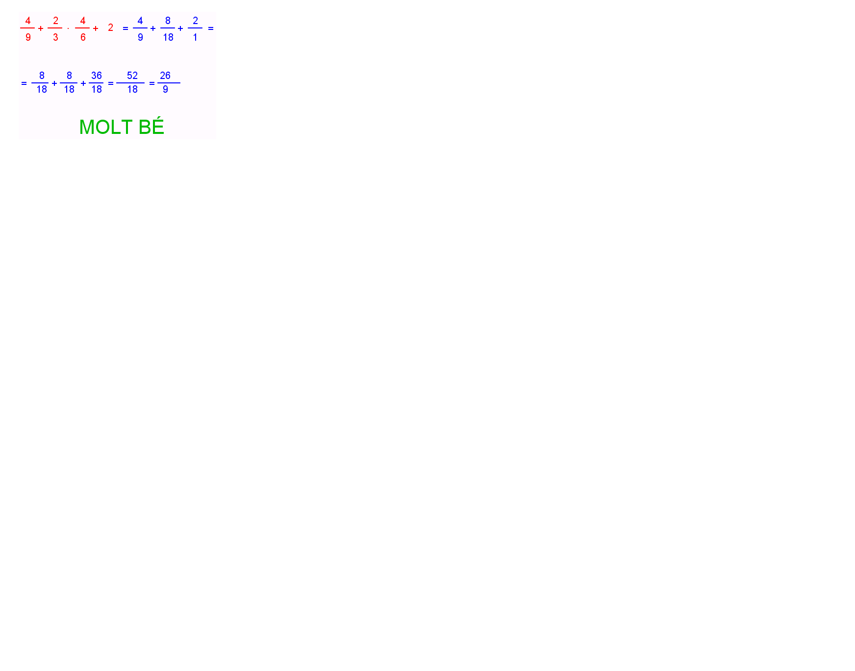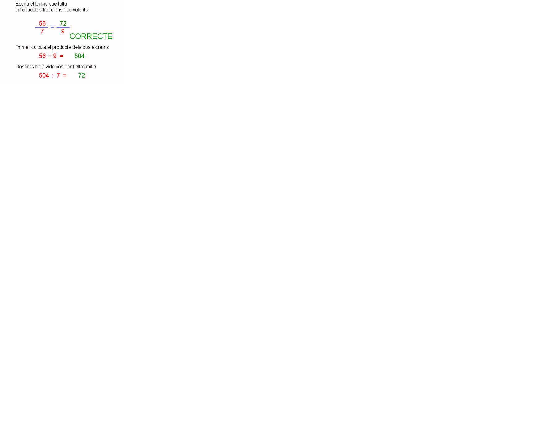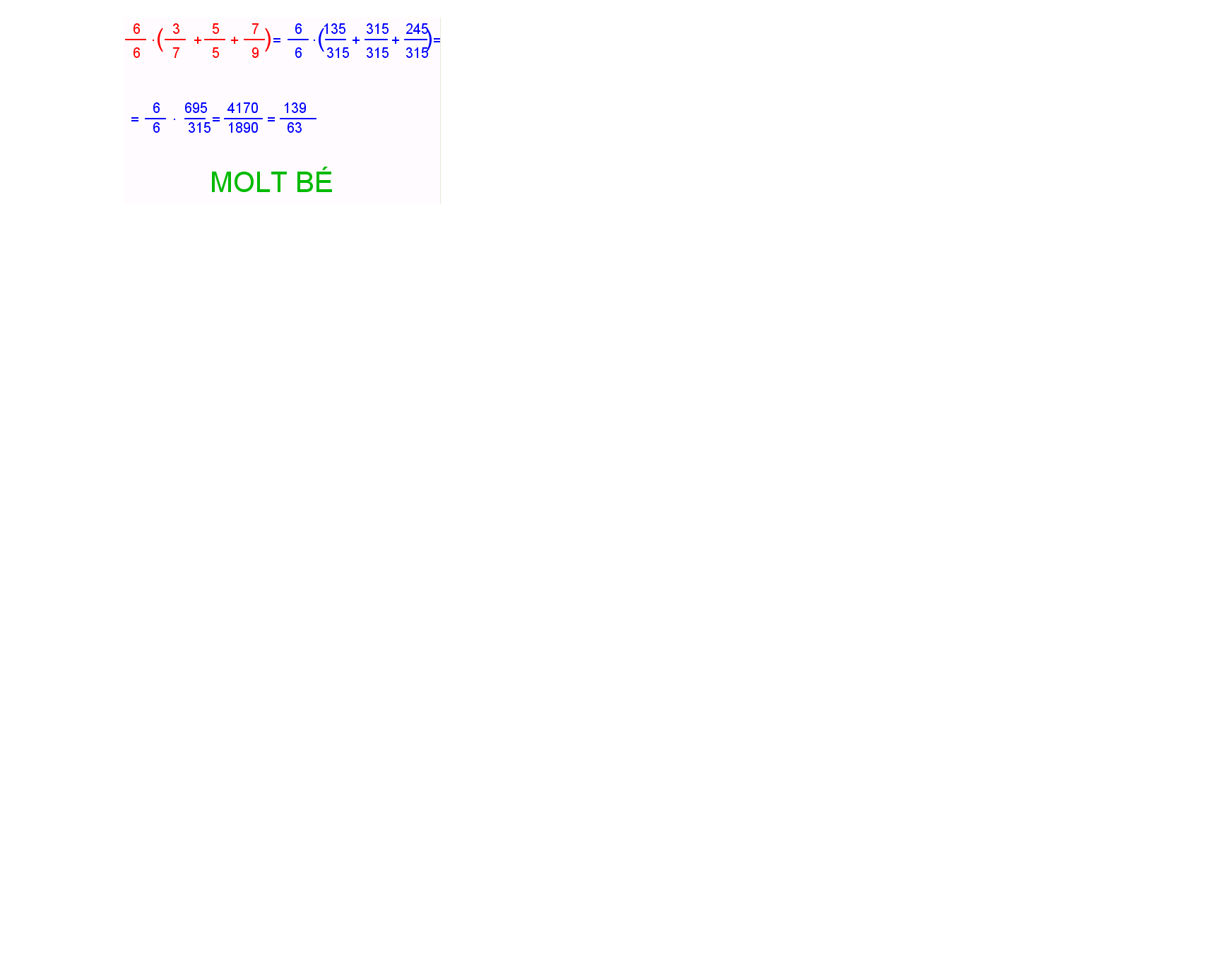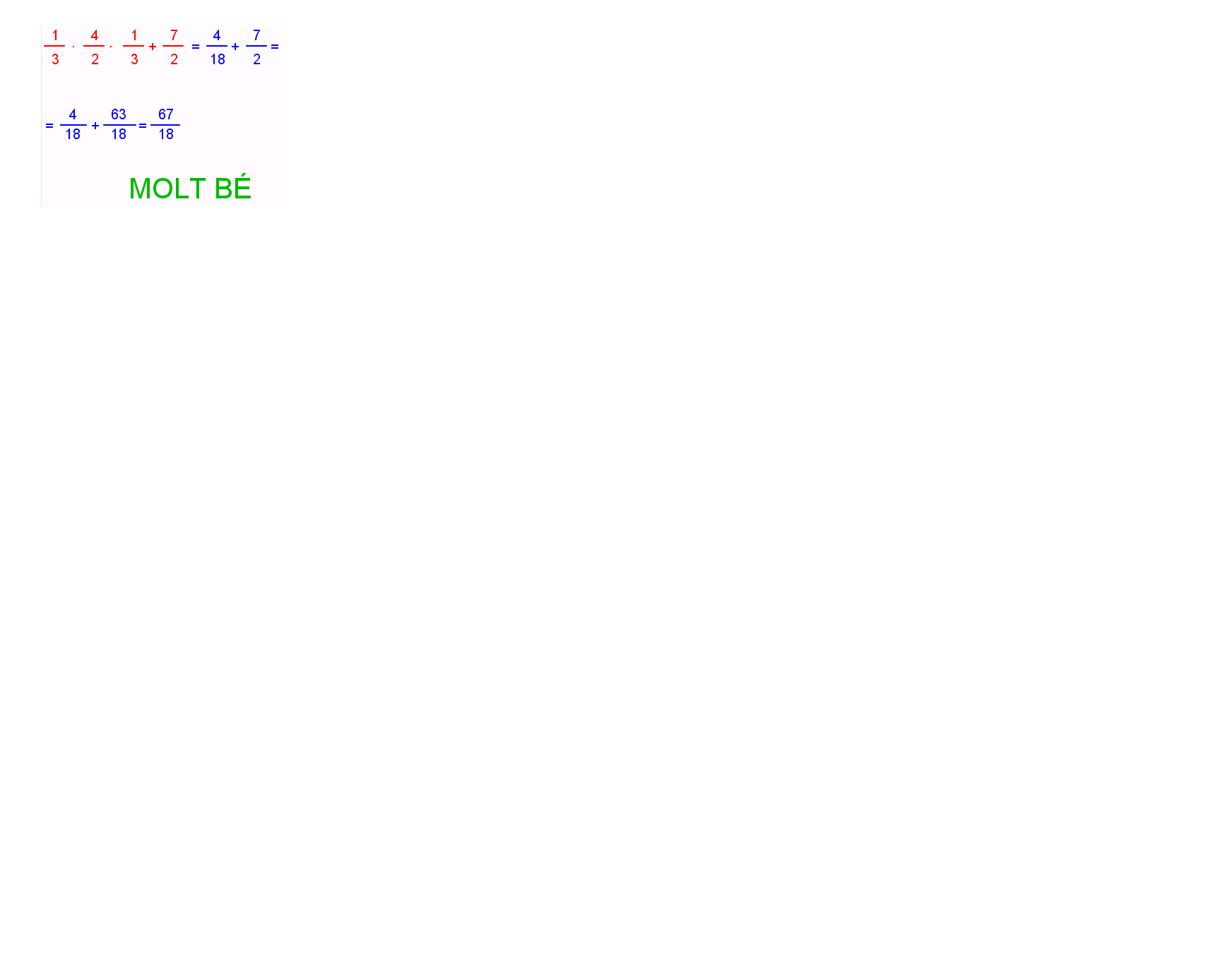 5.1.1 Les fraccions a la nostra vida quotidiana.png 5.1.2 Elements d'una fracció.png 5.1.3 Com es llegeix una fracció.png 5.1.4 Valor d'una fracció.png 5.1.5 De fracció a decimal.png 5.2.1a) Fraccions equivalents.png 5.2.1b) Fraccions equivalents.png 5.2.2 Productes creuats.png 5.2.3a) Simplificar una fracció.png 5.2.3b) Simplificar una fracció.png 5.3.1 Passar fracions a comú denominador.png 5.3.2a) Suma de fraccions.png 5.3.2b) Suma de fraccions.png 5.3.3a) Suma i resta de fraccions.png 5.3.3b) Suma i resta de fraccions.png 5.3.4 Multiplicació de fraccions.png 5.3.5 Fracció inversa d'una fracció.png 5.3.6 Divisió de fraccions.png 5.3.7(1) Operacions combinades.png 5.3.7(10) Operacions combinades.png 5.3.7(2) Operacions combinades.png 5.3.7(3) Operacions combinades.png 5.3.7(4) Operacions combinades.png 5.3.7(5) Operacions combinades.png 5.3.7(6) Operacions combinades.png 5.3.7(7) Operacions combinades.png 5.3.7(8) Operacions combinades.png 5.3.7(9) Operacions combinades.png 5.3.7 Operacions combinades.png Com es llegeix una fracció.png Elements d'una fracció.png Les fraccions.png Tema 5. Exercicis.cmap tema5 autovaluació.png tema5 enviar al tutor.png Tema 5 fraccions.cmap