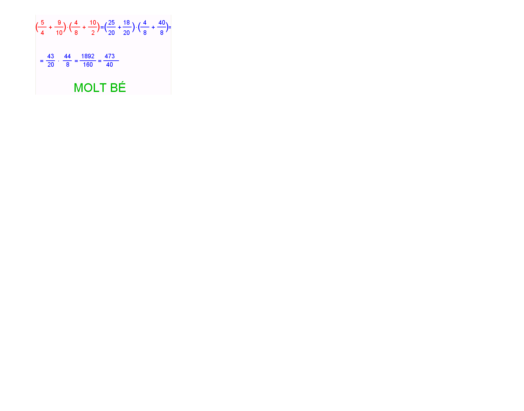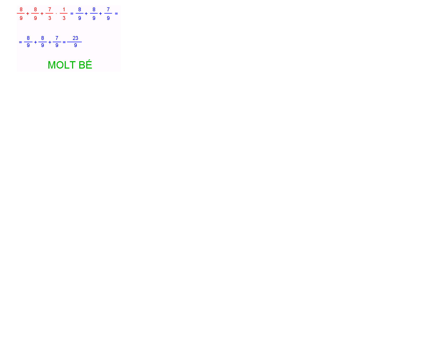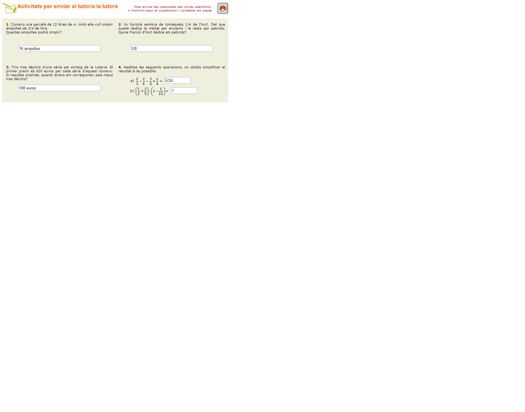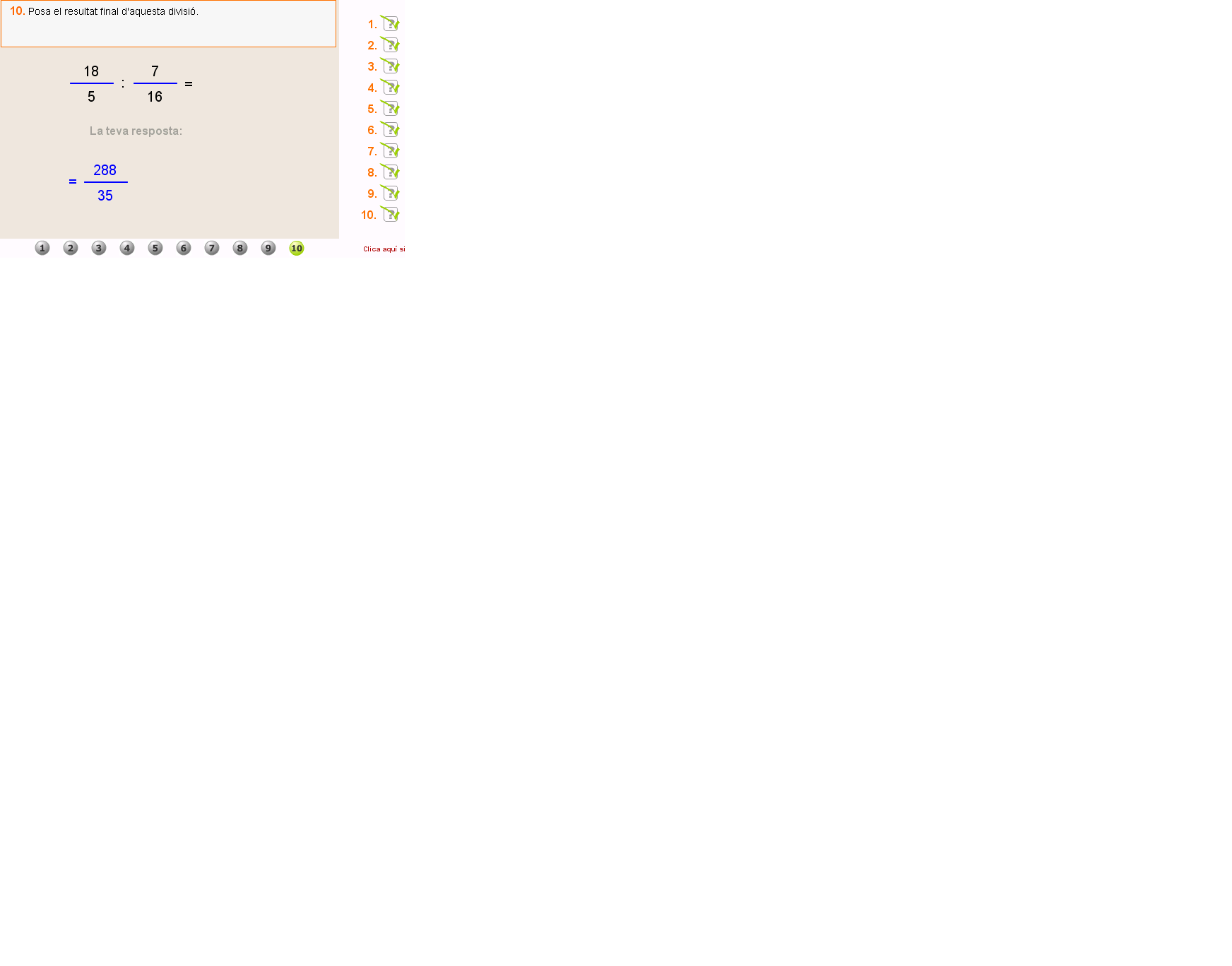 5.1.1 Les fraccions a la nostra vida quotidiana.png 5.1.2 Elements d'una fracció.png 5.1.3 Com es llegeix una fracció.png 5.1.4 Valor d'una fracció.png 5.1.5 De fracció a decimal.png 5.2.1a) Fraccions equivalents.png 5.2.1b) Fraccions equivalents.png 5.2.2 Productes creuats.png 5.2.3a) Simplificar una fracció.png 5.2.3b) Simplificar una fracció.png 5.3.1 Passar fracions a comú denominador.png 5.3.2a) Suma de fraccions.png 5.3.2b) Suma de fraccions.png 5.3.3a) Suma i resta de fraccions.png 5.3.3b) Suma i resta de fraccions.png 5.3.4 Multiplicació de fraccions.png 5.3.5 Fracció inversa d'una fracció.png 5.3.6 Divisió de fraccions.png 5.3.7(1) Operacions combinades.png 5.3.7(10) Operacions combinades.png 5.3.7(2) Operacions combinades.png 5.3.7(3) Operacions combinades.png 5.3.7(4) Operacions combinades.png 5.3.7(5) Operacions combinades.png 5.3.7(6) Operacions combinades.png 5.3.7(7) Operacions combinades.png 5.3.7(8) Operacions combinades.png 5.3.7(9) Operacions combinades.png 5.3.7 Operacions combinades.png Com es llegeix una fracció.png Elements d'una fracció.png Les fraccions.png Tema 5. Exercicis.cmap tema5 autovaluació.png tema5 enviar al tutor.png Tema 5 fraccions.cmap