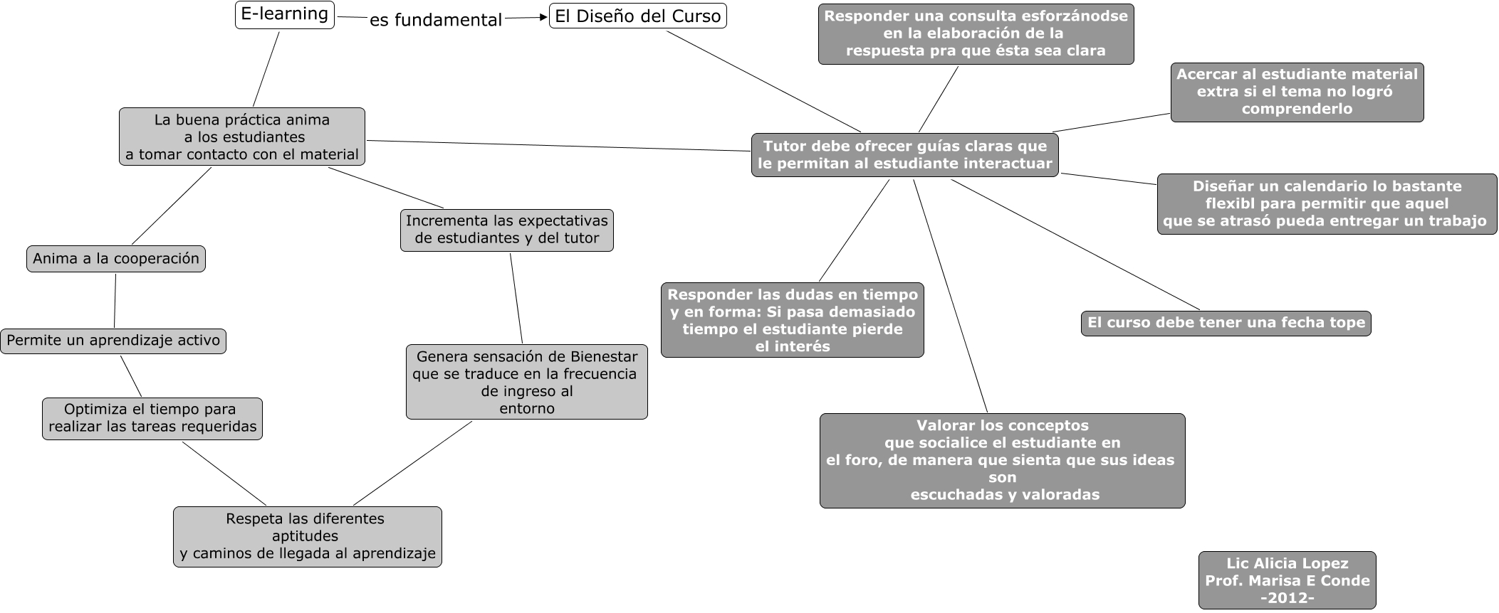 Este Cmap, tiene información relacionada con: E-learning, Genera sensación de Bienestar que se traduce en la frecuencia de ingreso al entorno Incrementa las expectativas de estudiantes y del tutor, Respeta las diferentes aptitudes y caminos de llegada al aprendizaje Genera sensación de Bienestar que se traduce en la frecuencia de ingreso al entorno, Anima a la cooperación Permite un aprendizaje activo, La buena práctica anima a los estudiantes a tomar contacto con el material Anima a la cooperación, Tutor debe ofrecer guías claras que le permitan al estudiante interactuar Diseñar un calendario lo bastante flexibl para permitir que aquel que se atrasó pueda entregar un trabajo, El Diseño del Curso Tutor debe ofrecer guías claras que le permitan al estudiante interactuar, Tutor debe ofrecer guías claras que le permitan al estudiante interactuar Responder una consulta esforzánodse en la elaboración de la respuesta pra que ésta sea clara, Tutor debe ofrecer guías claras que le permitan al estudiante interactuar Valorar los conceptos que socialice el estudiante en el foro, de manera que sienta que sus ideas son escuchadas y valoradas, Optimiza el tiempo para realizar las tareas requeridas Respeta las diferentes aptitudes y caminos de llegada al aprendizaje, Tutor debe ofrecer guías claras que le permitan al estudiante interactuar Responder las dudas en tiempo y en forma: Si pasa demasiado tiempo el estudiante pierde el interés, Tutor debe ofrecer guías claras que le permitan al estudiante interactuar El curso debe tener una fecha tope, La buena práctica anima a los estudiantes a tomar contacto con el material Tutor debe ofrecer guías claras que le permitan al estudiante interactuar, Permite un aprendizaje activo Optimiza el tiempo para realizar las tareas requeridas, Tutor debe ofrecer guías claras que le permitan al estudiante interactuar Acercar al estudiante material extra si el tema no logró comprenderlo, La buena práctica anima a los estudiantes a tomar contacto con el material Incrementa las expectativas de estudiantes y del tutor, E-learning es fundamental El Diseño del Curso, E-learning La buena práctica anima a los estudiantes a tomar contacto con el material