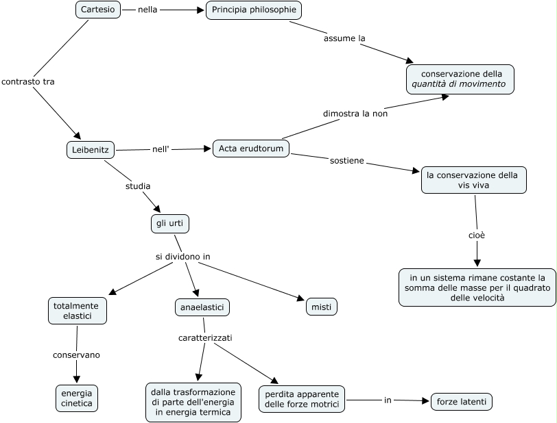 Questa Cmap, creata con IHMC CmapTools, contiene informazioni relative a: cartesioleibnitz, totalmente elastici conservano energia cinetica, gli urti si dividono in misti, la conservazione della vis viva cioè in un sistema rimane costante la somma delle masse per il quadrato delle velocità, Acta erudtorum dimostra la non conservazione della quantità di movimento, Acta erudtorum sostiene la conservazione della vis viva, gli urti si dividono in anaelastici, perdita apparente delle forze motrici in forze latenti, Cartesio nella Principia philosophie, Cartesio contrasto tra Leibenitz, anaelastici caratterizzati perdita apparente delle forze motrici, Principia philosophie assume la conservazione della quantità di movimento, anaelastici caratterizzati dalla trasformazione di parte dell'energia in energia termica, Leibenitz nell' Acta erudtorum, Leibenitz studia gli urti, gli urti si dividono in totalmente elastici