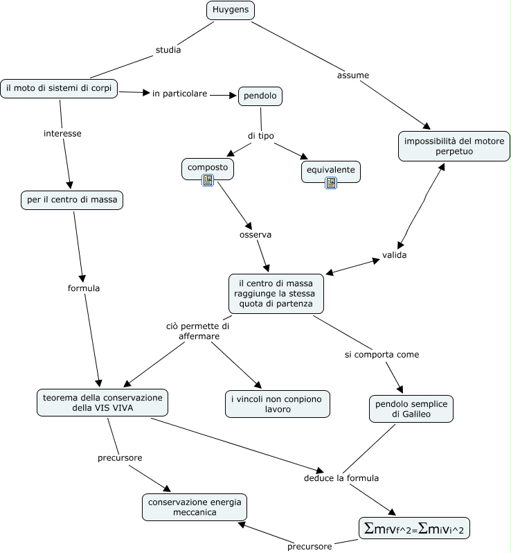 Questa Cmap, creata con IHMC CmapTools, contiene informazioni relative a: huygens, il moto di sistemi di corpi in particolare pendolo, Huygens studia il moto di sistemi di corpi, il centro di massa raggiunge la stessa quota di partenza ciò permette di affermare i vincoli non conpiono lavoro, per il centro di massa formula teorema della conservazione della VIS VIVA, teorema della conservazione della VIS VIVA deduce la formula Σmfvf^2=Σmivi^2, impossibilità del motore perpetuo valida il centro di massa raggiunge la stessa quota di partenza, il centro di massa raggiunge la stessa quota di partenza si comporta come pendolo semplice di Galileo, pendolo semplice di Galileo deduce la formula Σmfvf^2=Σmivi^2, teorema della conservazione della VIS VIVA precursore conservazione energia meccanica, pendolo di tipo equivalente, pendolo di tipo composto, Σmfvf^2=Σmivi^2 precursore conservazione energia meccanica, composto osserva il centro di massa raggiunge la stessa quota di partenza, il moto di sistemi di corpi interesse per il centro di massa, il centro di massa raggiunge la stessa quota di partenza ciò permette di affermare teorema della conservazione della VIS VIVA, Huygens assume impossibilità del motore perpetuo