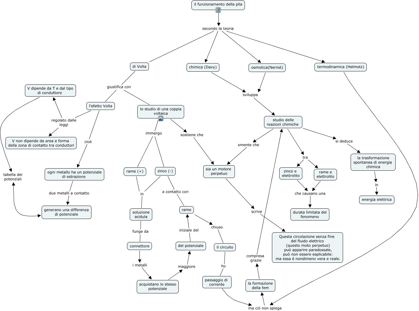 Questa Cmap, creata con IHMC CmapTools, contiene informazioni relative a: pila, rame (+) in soluzione acidula, ogni metallo ha un potenziale di estrazione due metalli a contatto generano una differenza di potenziale, la formazione della fem compresa grazie studio delle reazioni chimiche, il circuito ho passaggio di corrente, di Volta giustifica con l'efetto Volta, termodinamica (Helmotz) ma ciò non spiega la formazione della fem, di Volta giustifica con lo studio di una coppia voltaica, chimica (Davy) sviluppa studio delle reazioni chimiche, osmotica(Nernst) sviluppa studio delle reazioni chimiche, acquistano lo stesso potenziale maggiore del potenziale, del potenziale iniziale del rame, il funzionamento della pila secondo la teoria osmotica(Nernst), l'efetto Volta cioè ogni metallo ha un potenziale di estrazione, il funzionamento della pila secondo la teoria di Volta, lo studio di una coppia voltaica immergo zinco (-), rame chiuso il circuito, il funzionamento della pila secondo la teoria chimica (Davy), soluzione acidula funge da connettore, studio delle reazioni chimiche tra rame e elettrolito, studio delle reazioni chimiche si deduce la trasformazione spontanea di energia chimica