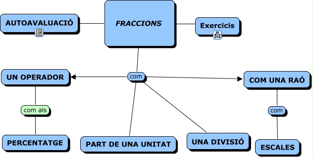 Aquest mapa conceptual conté informació relacionada amb: Tema 5. Fraccions, FRACCIONS com PART DE UNA UNITAT, FRACCIONS com COM UNA RAÓ, UN OPERADOR com als PERCENTATGE, FRACCIONS Exercicis, FRACCIONS ???? AUTOAVALUACIÓ, FRACCIONS com UN OPERADOR, FRACCIONS com UNA DIVISIÓ, COM UNA RAÓ com ESCALES