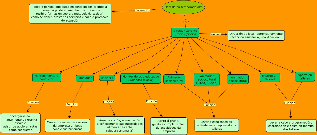 Este Cmap, tiene información relacionada con: recursos humanos, Director Gerente (Rocío) (Socio) . Limpiador, Monitor de ocio educativo (Yolanda) (Socio) Función Asistir ó grupo, guialo e cumplir o plan de actividades da empresa, Director Gerente (Rocío) (Socio) . Animador sociocultural, Director Gerente (Rocío) (Socio) . Animador sociocultural, Director Gerente (Rocío) (Socio) . Experto en talleres, cocinero Función Área de cociña, alimentación e coñecemento das necesidades alimentarias ante calquera anomalía), Animador sociocultural Función Levar a cabo todas as actividades exceptuando os talleres, Limpiador Función Manter todas as instalacións da empresa en boas condicións hixiénicas, Experto en talleres Función Levar a cabo a programación, coordinación e posta en marcha dos talleres, Director Gerente (Rocío) (Socio) función Dirección de local, aprovisionamiento recepción asistencia, coordinación..., Director Gerente (Rocío) (Socio) . Animador sociocultural (Silvia) (Socio), Director Gerente (Rocío) (Socio) . Mantenimiento y conductor, Plantilla en temporada alta ???? Director Gerente (Rocío) (Socio), Animador sociocultural (Silvia) (Socio) Función Levar a cabo todas as actividades exceptuando os talleres, Mantenimiento y conductor Función Encargarse do mantemento da granxa escola e asistir de apoio en rutas como conductor, Director Gerente (Rocío) (Socio) . Monitor de ocio educativo (Yolanda) (Socio), Plantilla en temporada alta Formación Todo o persoal que estea en contacto cos clientes a través da posta en marcha dos productos recibirá formación sobre a metodoloxía Waldof, como se deben prestar os servicios e cal é o protocolo de actuación, Experto en talleres Función Levar a cabo a programación, coordinación e posta en marcha dos talleres, Animador sociocultural Función Levar a cabo todas as actividades exceptuando os talleres, Director Gerente (Rocío) (Socio) . cocinero