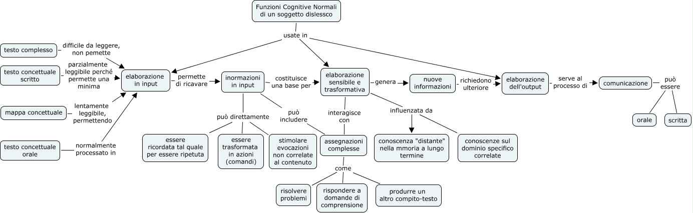 Questa Cmap, creata con IHMC CmapTools, contiene informazioni relative a: modello_di_processing_dislessia, inormazioni in input può direttamente stimolare evocazioni non correlate al contenuto, assegnazioni complesse come produrre un altro compito-testo, testo complesso difficile da leggere, non pemette elaborazione in input, assegnazioni complesse come risolvere problemi, Funzioni Cognitive Normali di un soggetto dislessco usate in elaborazione sensibile e trasformativa, inormazioni in input può direttamente essere trasformata in azioni (comandi), Funzioni Cognitive Normali di un soggetto dislessco usate in elaborazione dell'output, testo concettuale orale normalmente processato in elaborazione in input, elaborazione sensibile e trasformativa interagisce con assegnazioni complesse, comunicazione può essere orale, inormazioni in input costituisce una base per elaborazione sensibile e trasformativa, elaborazione sensibile e trasformativa influenzata da conoscenza "distante" nella mmoria a lungo termine, assegnazioni complesse come rispondere a domande di comprensione, inormazioni in input può includere assegnazioni complesse, nuove informazioni richiedono ulteriore elaborazione dell'output, comunicazione può essere scritta, elaborazione in input permette di ricavare inormazioni in input, elaborazione sensibile e trasformativa influenzata da conoscenze sul dominio specifico correlate, testo concettuale scritto parzialmente leggibile perché permette una minima elaborazione in input, elaborazione sensibile e trasformativa genera nuove informazioni