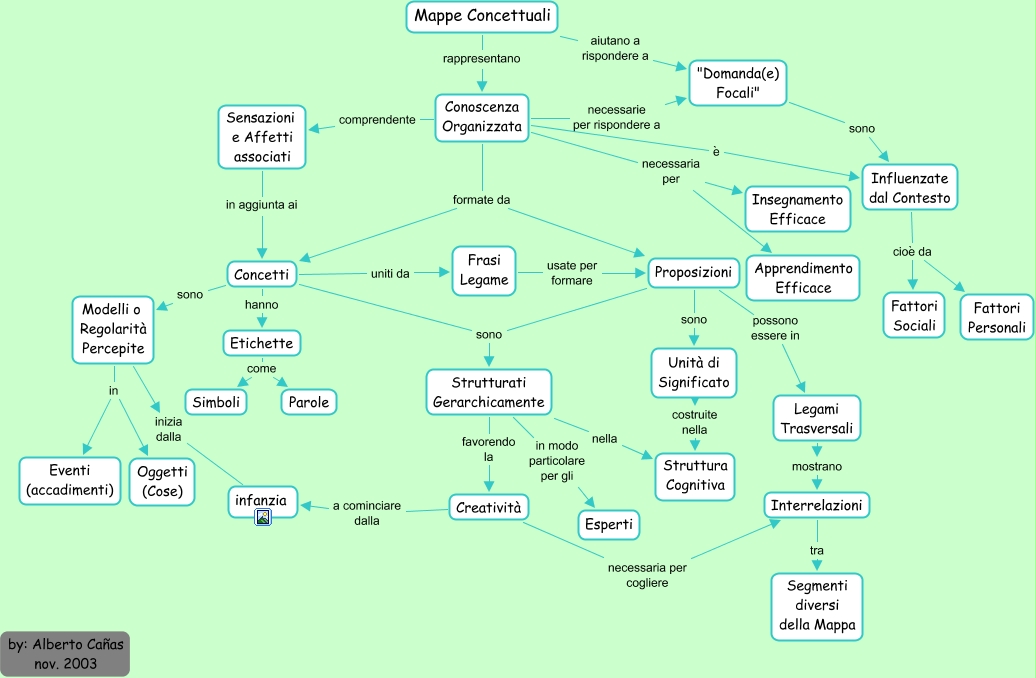 Questa Cmap, creata con IHMC CmapTools, contiene informazioni relative a: Mappa Concettuale sulle Mappe Concettuali, Proposizioni sono Strutturati Gerarchicamente, Concetti uniti da Frasi Legame, Etichette come Simboli, Concetti hanno Etichette, Mappe Concettuali rappresentano Conoscenza Organizzata, Mappe Concettuali aiutano a rispondere a "Domanda(e) Focali", Concetti sono Modelli o Regolarità Percepite, Interrelazioni tra Segmenti diversi della Mappa, Etichette come Parole, Legami Trasversali mostrano Interrelazioni, Conoscenza Organizzata comprendente Sensazioni e Affetti associati, Modelli o Regolarità Percepite inizia dalla infanzia, "Domanda(e) Focali" sono Influenzate dal Contesto, Strutturati Gerarchicamente in modo particolare per gli Esperti, Sensazioni e Affetti associati in aggiunta ai Concetti, Creatività a cominciare dalla infanzia, Proposizioni possono essere in Legami Trasversali, Proposizioni sono Unità di Significato, Unità di Significato costruite nella Struttura Cognitiva, Influenzate dal Contesto cioè da Fattori Sociali