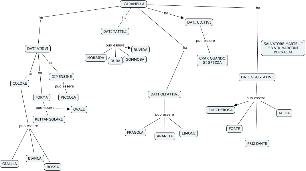 Questa Cmap, creata con IHMC CmapTools, contiene informazioni relative a: CARAMELLA_salvatore, DATI GGUSTATIVI puo essere ACIDA, CARAMELLA ha DATI TATTILI, COLORE puo essere ROSSA, DATI TATTILI puo essere MORBIDA, DATI GGUSTATIVI puo essere FRIZZANTE, DATI UDITIVI puo essere CRAK QUANDO SI SPEZZA, DATI TATTILI puo essere RUVIDA, DATI OLFATTIVI puo essere FRAGOLA, DATI TATTILI puo essere GOMMOSA, CARAMELLA ha DATI UDITIVI, CARAMELLA ha DATI GGUSTATIVI, COLORE puo essere BIANCA, DATI VISIVI ha COLORE, COLORE puo essere GIALLLA, DATI TATTILI puo essere DURA, FORMA puo essere RETTANGOLARE, DATI GGUSTATIVI puo essere ZUCCHEROSA, DATI VISIVI ha FORMA, DATI OLFATTIVI puo essere ARANCIA, DATI GGUSTATIVI puo essere FORTE