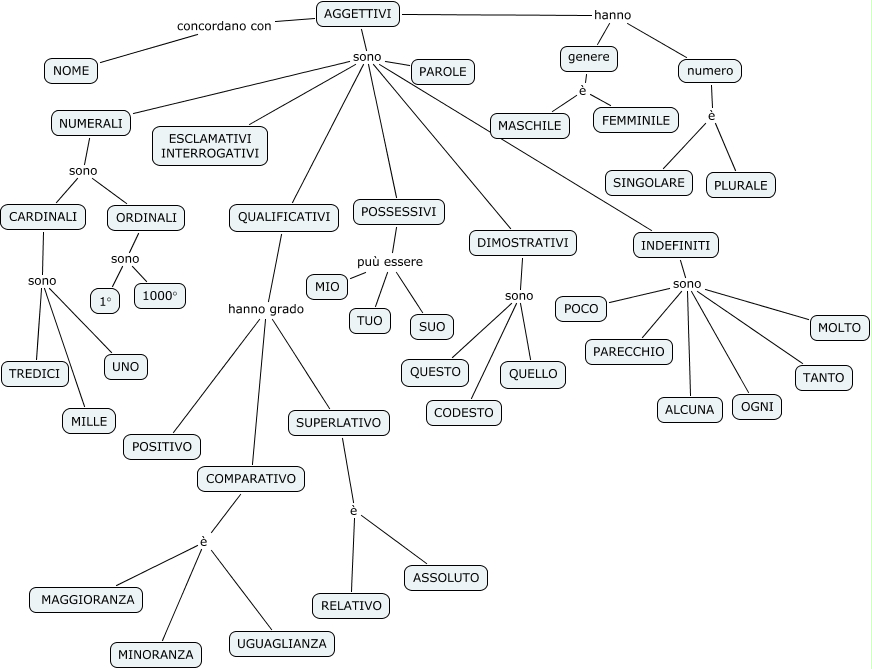 Questa Cmap, creata con IHMC CmapTools, contiene informazioni relative a: AGGETTIVI, COMPARATIVO è MAGGIORANZA, INDEFINITI sono OGNI, AGGETTIVI concordano con NOME, DIMOSTRATIVI sono QUELLO, COMPARATIVO è MINORANZA, genere è MASCHILE, AGGETTIVI hanno numero, POSSESSIVI puù essere SUO, QUALIFICATIVI hanno grado SUPERLATIVO, UNO sono MILLE, QUALIFICATIVI hanno grado COMPARATIVO, DIMOSTRATIVI sono CODESTO, ORDINALI sono 1°, AGGETTIVI sono QUALIFICATIVI, AGGETTIVI sono ESCLAMATIVI INTERROGATIVI, POSSESSIVI puù essere MIO, CARDINALI sono MILLE, INDEFINITI sono POCO, INDEFINITI sono TANTO, COMPARATIVO è UGUAGLIANZA