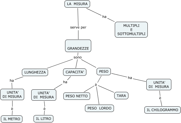 Questa Cmap, creata con IHMC CmapTools, contiene informazioni relative a: LA MISURA, UNITA' DI MISURA è IL METRO, UNITA' DI MISURA è IL CHILOGRAMMO, PESO è PESO LORDO, PESO ha UNITA' DI MISURA, GRANDEZZE sono CAPACITA', LUNGHEZZA ha UNITA' DI MISURA, LA MISURA ha MULTIPLI E SOTTOMULTIPLI, GRANDEZZE sono PESO, GRANDEZZE sono LUNGHEZZA, PESO è PESO NETTO, PESO è TARA, CAPACITA' ha UNITA' DI MISURA, UNITA' DI MISURA è IL LITRO, LA MISURA serve per GRANDEZZE