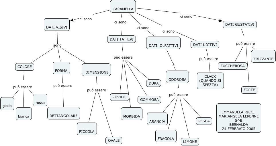 Questa Cmap, creata con IHMC CmapTools, contiene informazioni relative a: CARAMELLA_manuela_mariangela, ODOROSA può essere ARANCIA, COLORE può essere rossa, DATI VISIVI sono DIMENSIONE, DATI GUSTATIVI può essere ZUCCHEROSA, COLORE può essere bianca, ODOROSA può essere FRAGOLA, CARAMELLA ci sono DATI OLFATTIVI, COLORE può essere gialla, DATI OLFATTIVI è ODOROSA, DATI UDITIVI può essere CLACK (QUANDO SI SPEZZA), DATI TATTIVI può essere MORBIDA, FORMA può essere RETTANGOLARE, CARAMELLA ci sono DATI VISIVI, DATI GUSTATIVI può essere FORTE, ODOROSA può essere PESCA, DATI GUSTATIVI può essere FRIZZANTE, DATI TATTIVI può essere DURA, DATI TATTIVI può essere RUVIDO, DATI VISIVI sono COLORE, CARAMELLA ci sono DATI GUSTATIVI