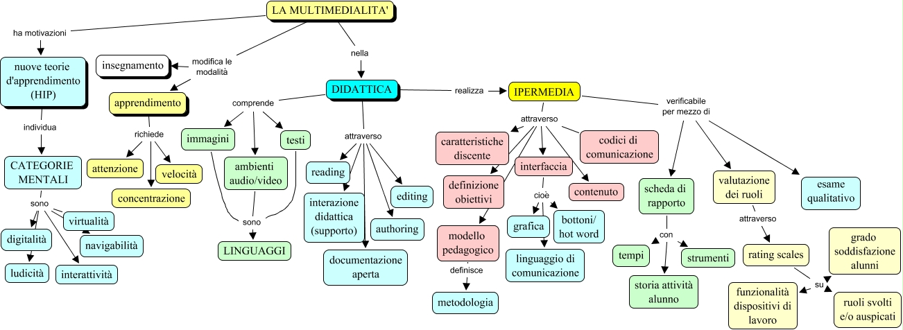 Questa Cmap, creata con IHMC CmapTools, contiene informazioni relative a: multimedialitaÌ€, rating scales su grado soddisfazione alunni, DIDATTICA comprende immagini, immagini sono LINGUAGGI, IPERMEDIA attraverso interfaccia, interfaccia cioè grafica, CATEGORIE MENTALI sono virtualità, apprendimento richiede attenzione, IPERMEDIA attraverso contenuto, DIDATTICA attraverso authoring, IPERMEDIA verificabile per mezzo di scheda di rapporto, nuove teorie d'apprendimento (HIP) individua CATEGORIE MENTALI, DIDATTICA realizza IPERMEDIA, IPERMEDIA attraverso definizione obiettivi, testi sono LINGUAGGI, ambienti audio/video sono LINGUAGGI, CATEGORIE MENTALI sono navigabilità, CATEGORIE MENTALI sono interattività, IPERMEDIA verificabile per mezzo di valutazione dei ruoli, CATEGORIE MENTALI sono digitalità, apprendimento richiede concentrazione